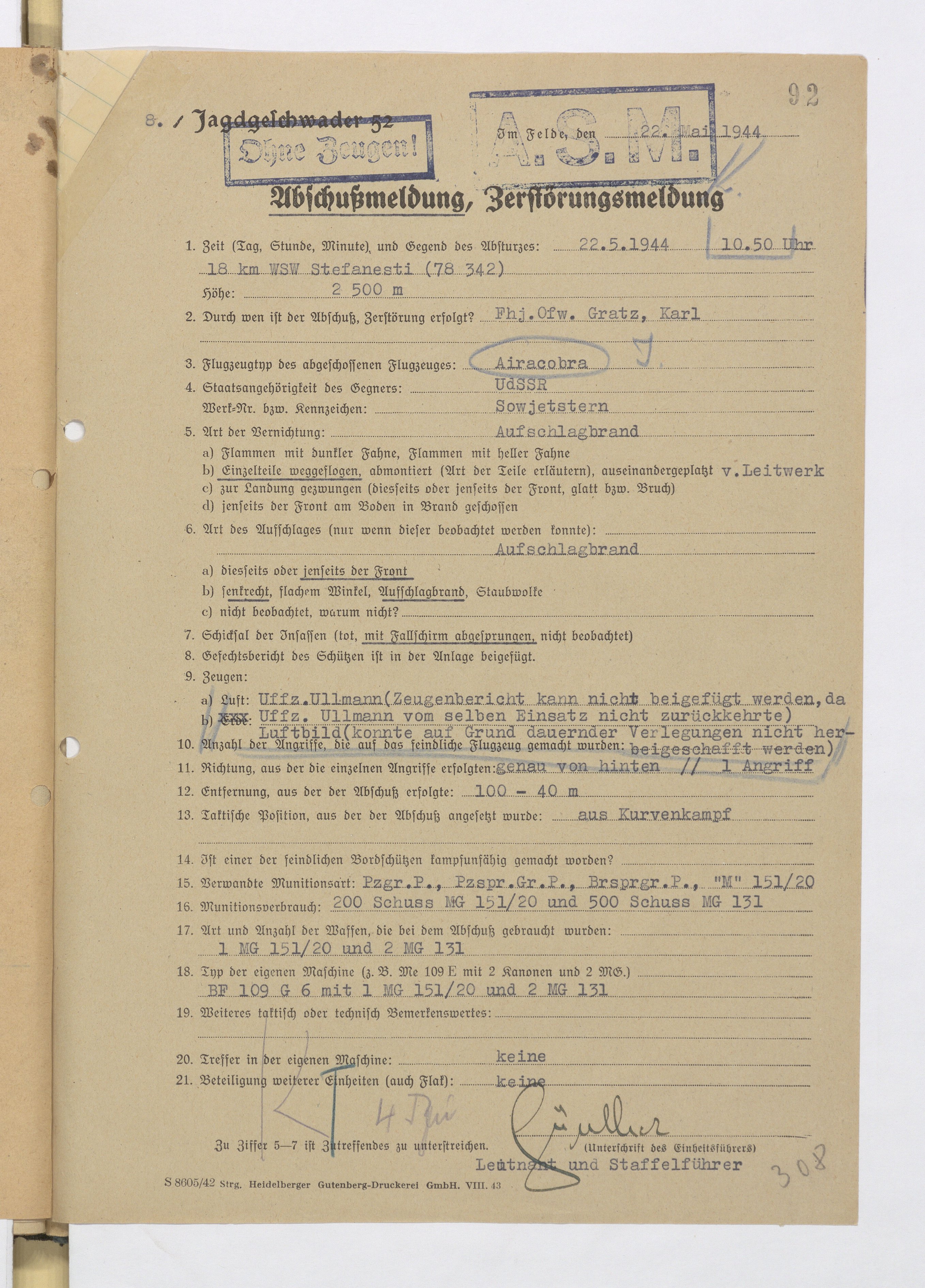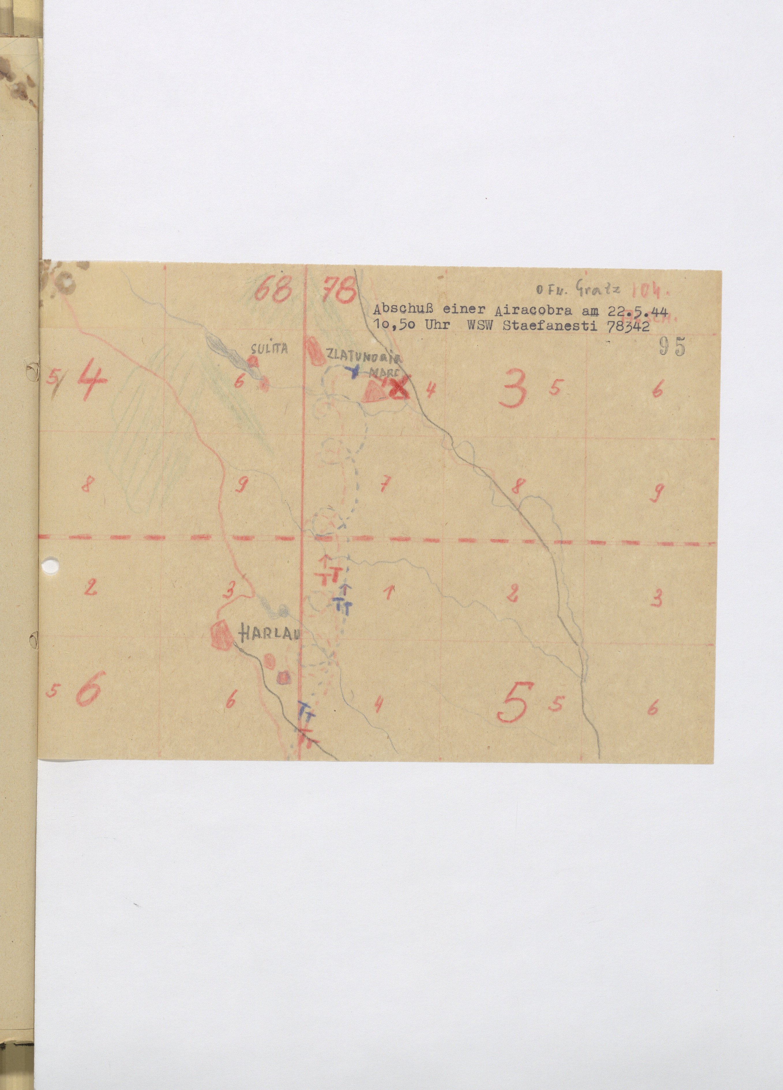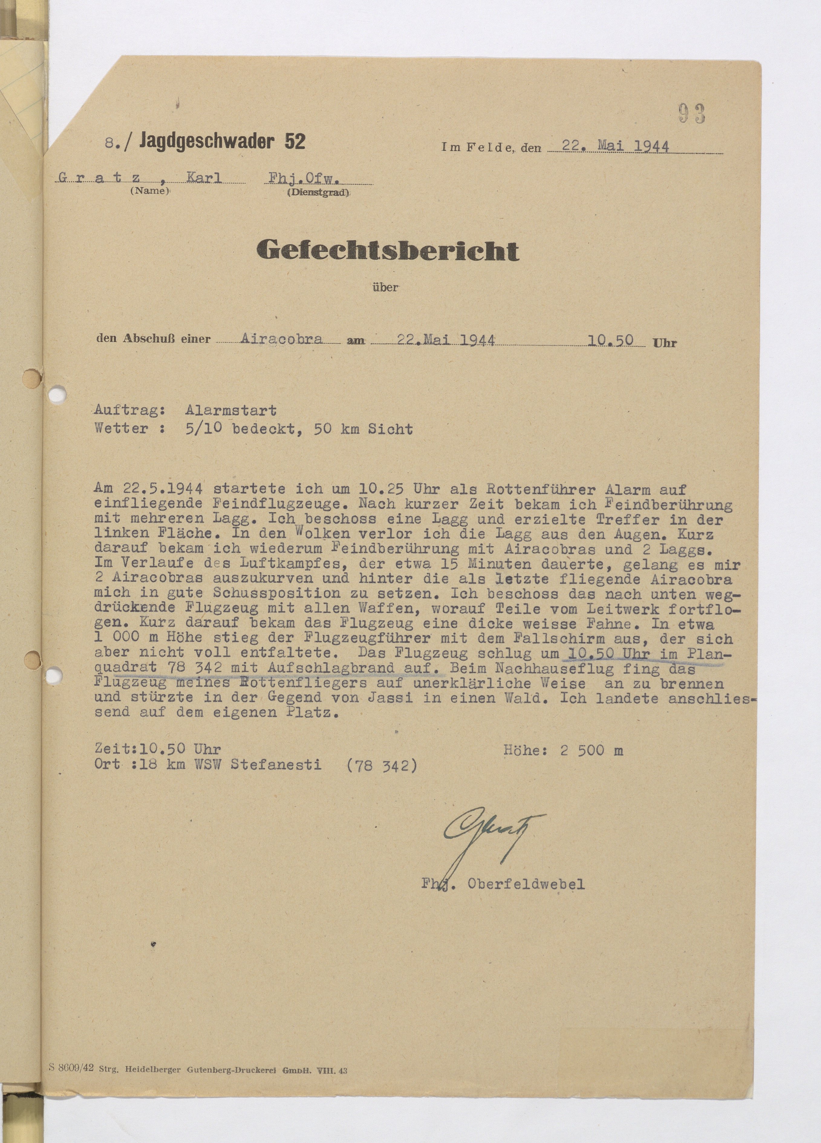 У немцев: Заявка Карла Граца на сбитый советский самолет. 22.51944 в 10.25 берлинского как ведущий вступил в бой с "ЛаГГами", а затем и с Аэрокобрами. В течении около 15 минут якобы сбил две Аэрокобры и атаковал еще одну. Полетели куски хвостового оперения и пошел дым. На высоте 1000 м летчик выбросился с парашютом, который не раскрылся полностью. В 10.50 самолет упал в нескольких км к  ЮВ от Злэтуноая, что в 30 км ЮВ Ботошаны, Румыния.. Во время возвращения самолет ведомого Граца по неизвестной причине загорелся и врезался с лес в районе Яссы.