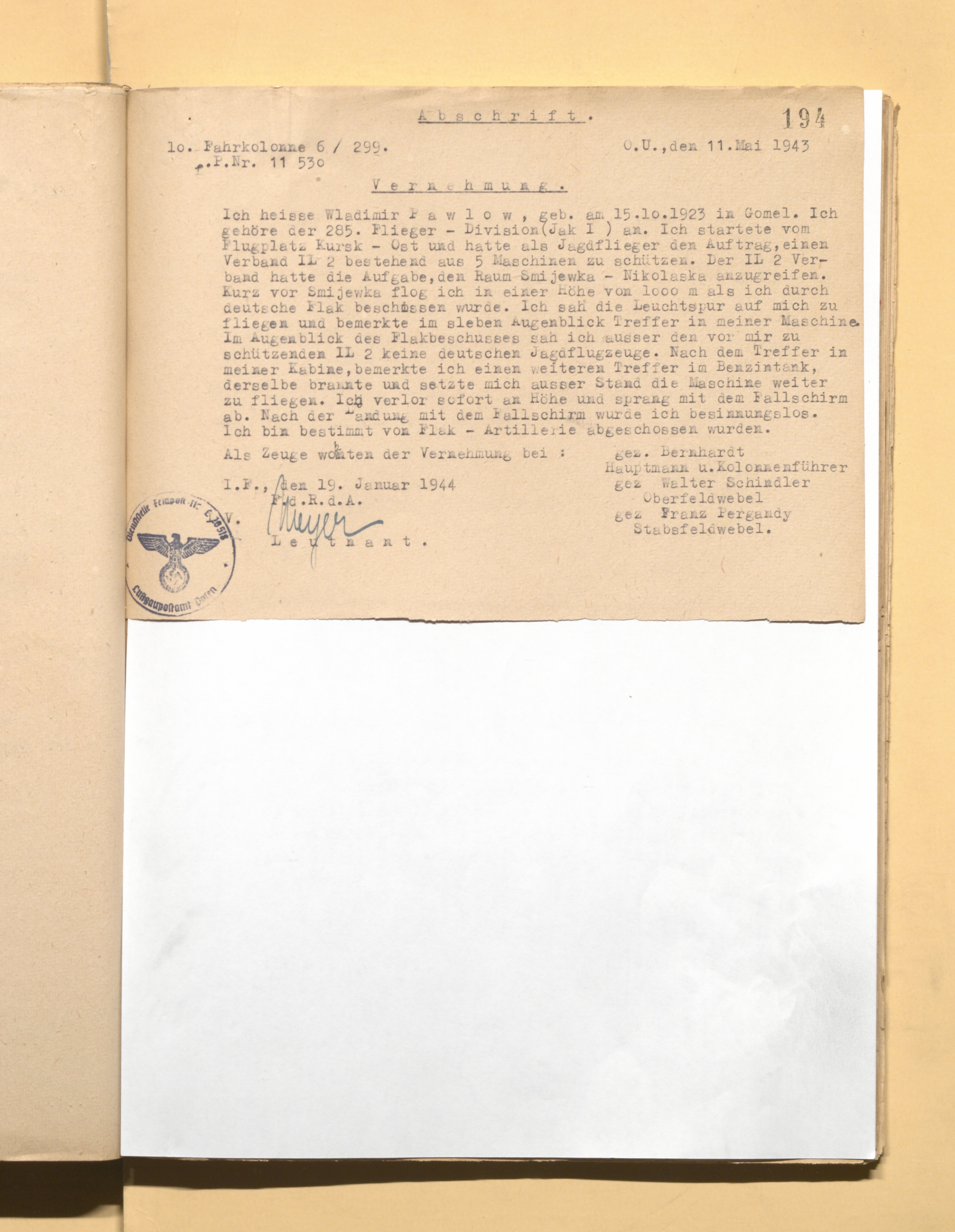 У немцев: заявка на сбитый ЗА советский самолет Як-1 и допрос пилота.  11.5.1943 в 12.35 берлинского в районе Александровка, в 500 м восточнее Бонки (в 8 км СВ Змиёвка Орловской области). Вылетел с аэродрома Курск восточный. мл. л-т Павлов Владимир, 285 ад. 1923 г.р., Гомель. Выпрыгнул с парашютом, взят в плен фельджандармами.