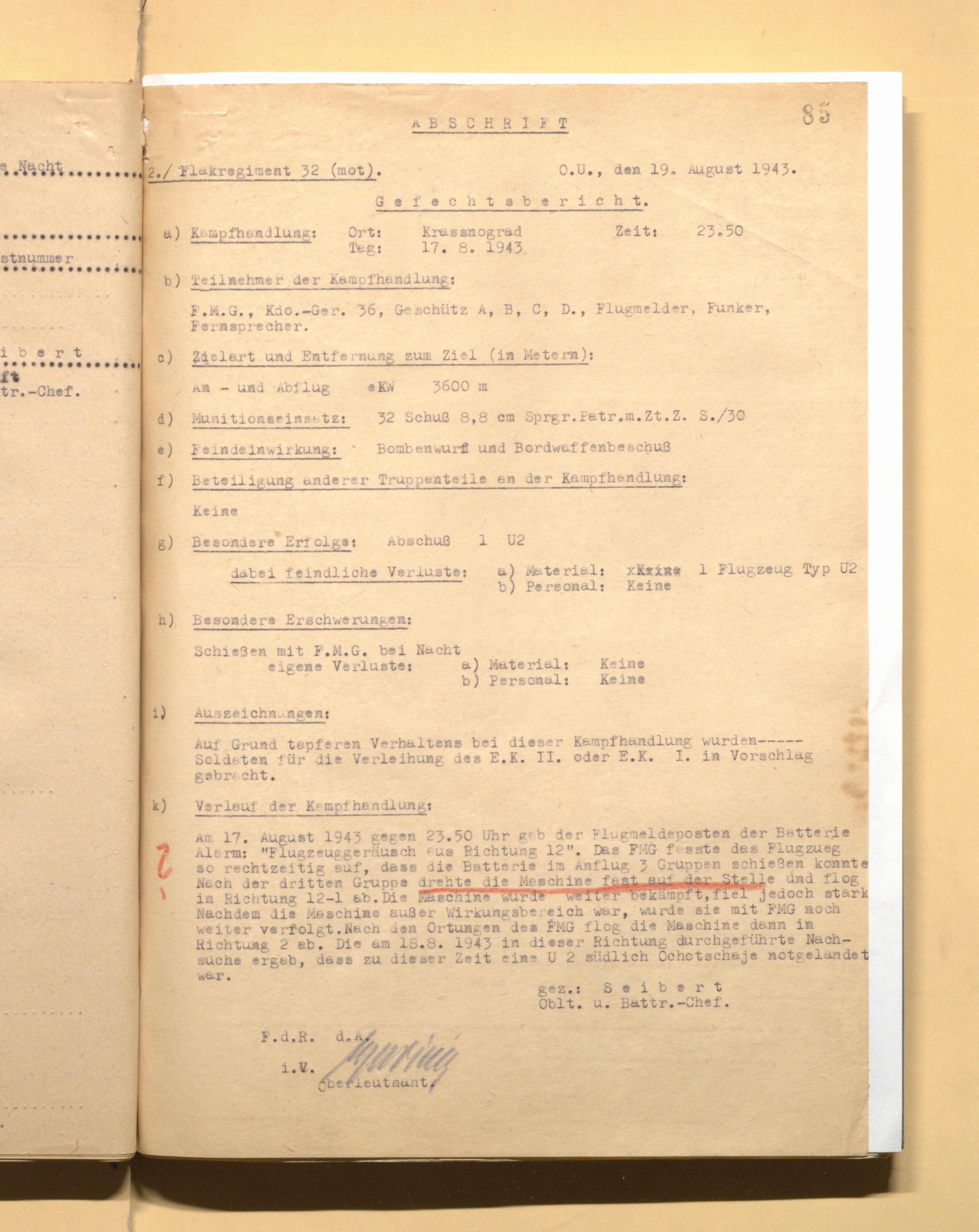 17.08.43 г. нбз экипаж У-2 в составе: командир звена мл. лейтенант Гузнищев Александр Фёдорович (1910 г.р., уроженец с. Лучинское Большесельского р-на Ярославской обл.) и штурман звена мл. лейтенант Чесноков Алексей Андреевич (1920 г.р., уроженец г. Старый Оскол Курской обл.).
