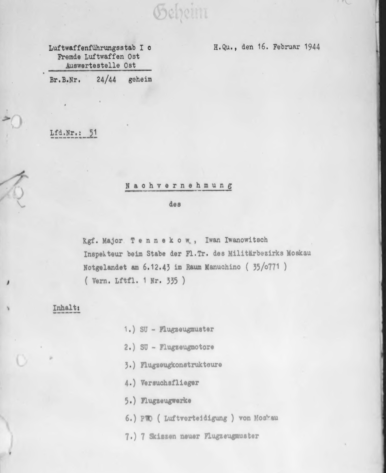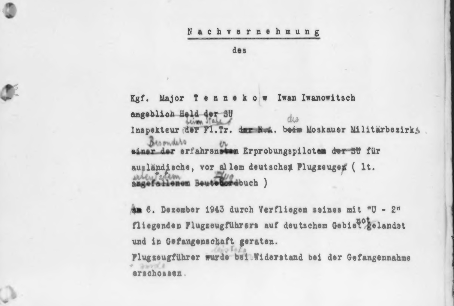 У фрицев – майор Теников Иван Иванович, инспектор штаба МВО совершил аварийную посадку 6.12.43 г. в районе Манухино.