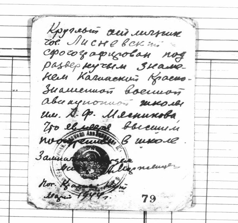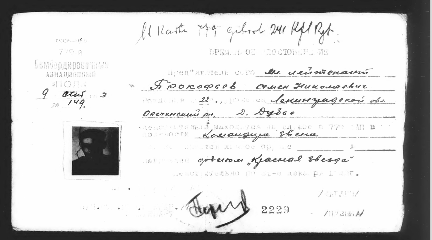 мл. лейтенант Прокофьев Семен Николаевич, 1921 г.р., уроженец п. Боровичи Ленинградская обл. Как летчик старший 779 бап был представлен к награждению 13.07.43 г. за 11 успешных боевых вылетов и прикрытие командира группы от атак истребителей противника (приказ о награждении подписан через 3 дня).
