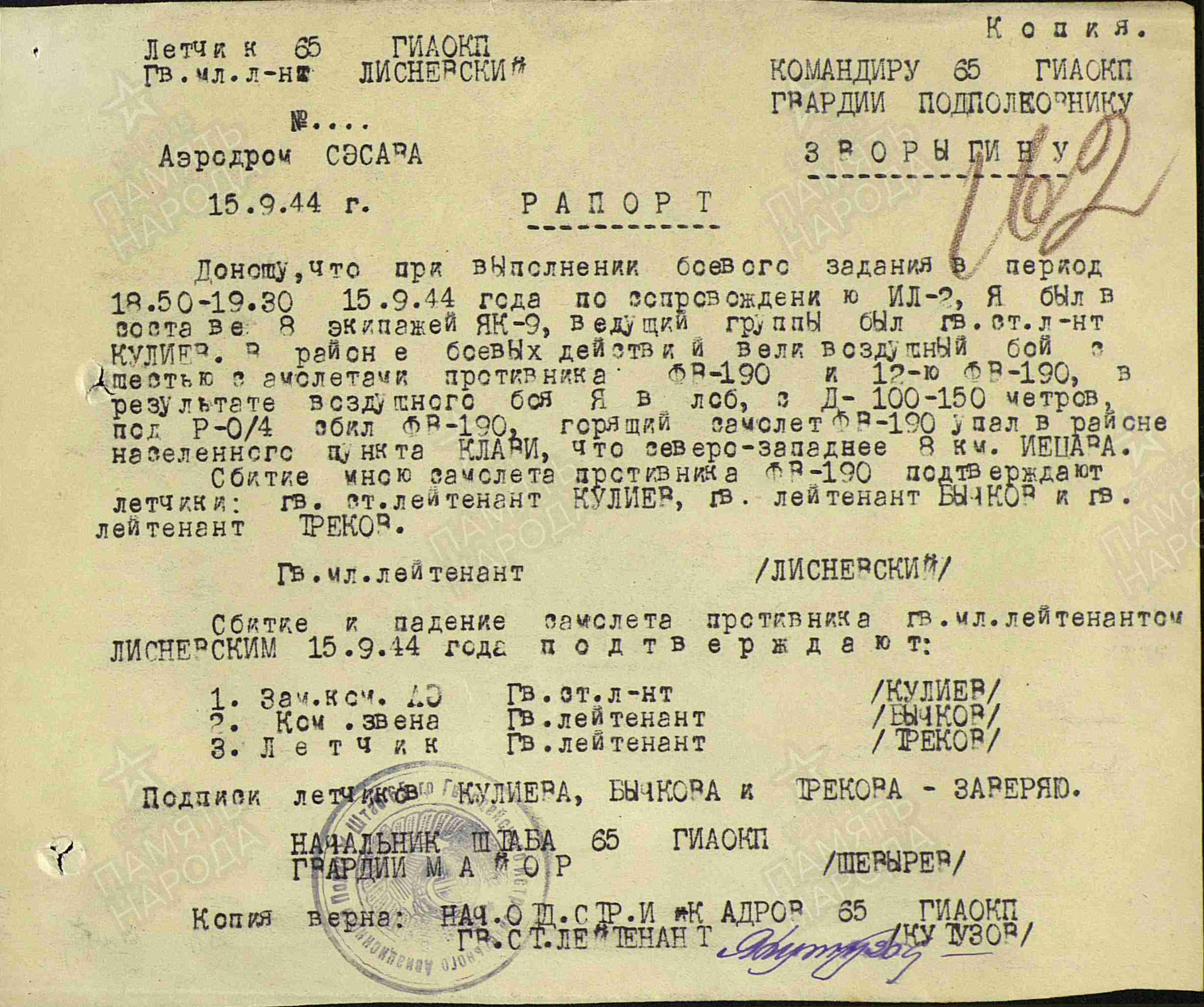 Как вариант – это летчик 65 гв. иап гв. мл. лейтенант Лисневский Владимир Иосифович, 1923 г.р., уроженец г. Первомайск Одесской обл. В Отечественной войне с июля 1944 года, воевал на 3 Белорусском и 1 Прибалтийском фронтах. К сентябрю 1944 года произвел 37 боевых вылетов, из них 35 на сопровождение штурмовиков и бомбардировщиков, провел в 8 воздушных боев, сбил 1 самолёт противника ФВ-190.