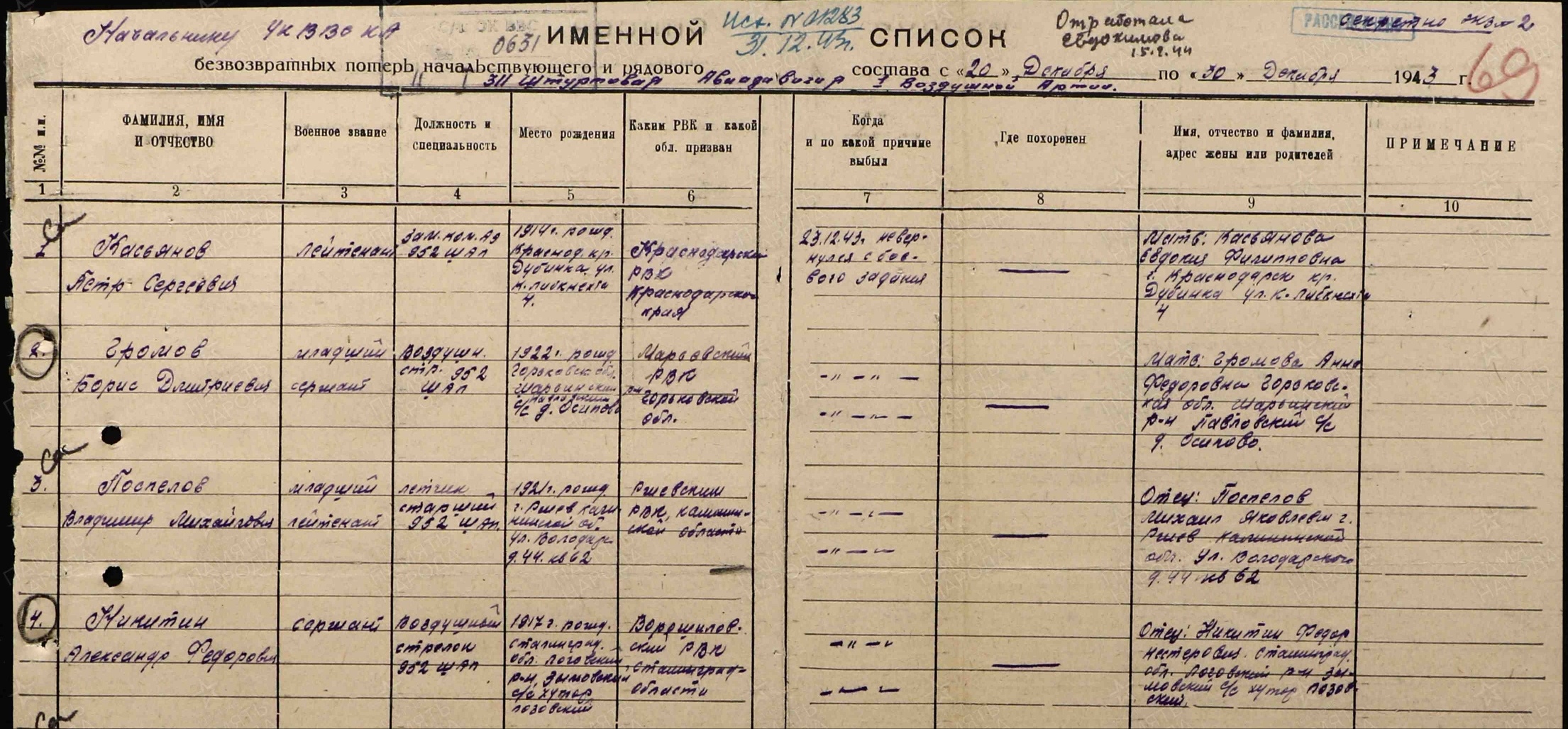 зам. командира АЭ лейтенант Касьянов Петр Сергеевич, 1914 г.р., уроженец Дубинка Краснодарского края, не вернулся с боевого задания 23.12.43 г. из района д. Васьково Витебской обл.