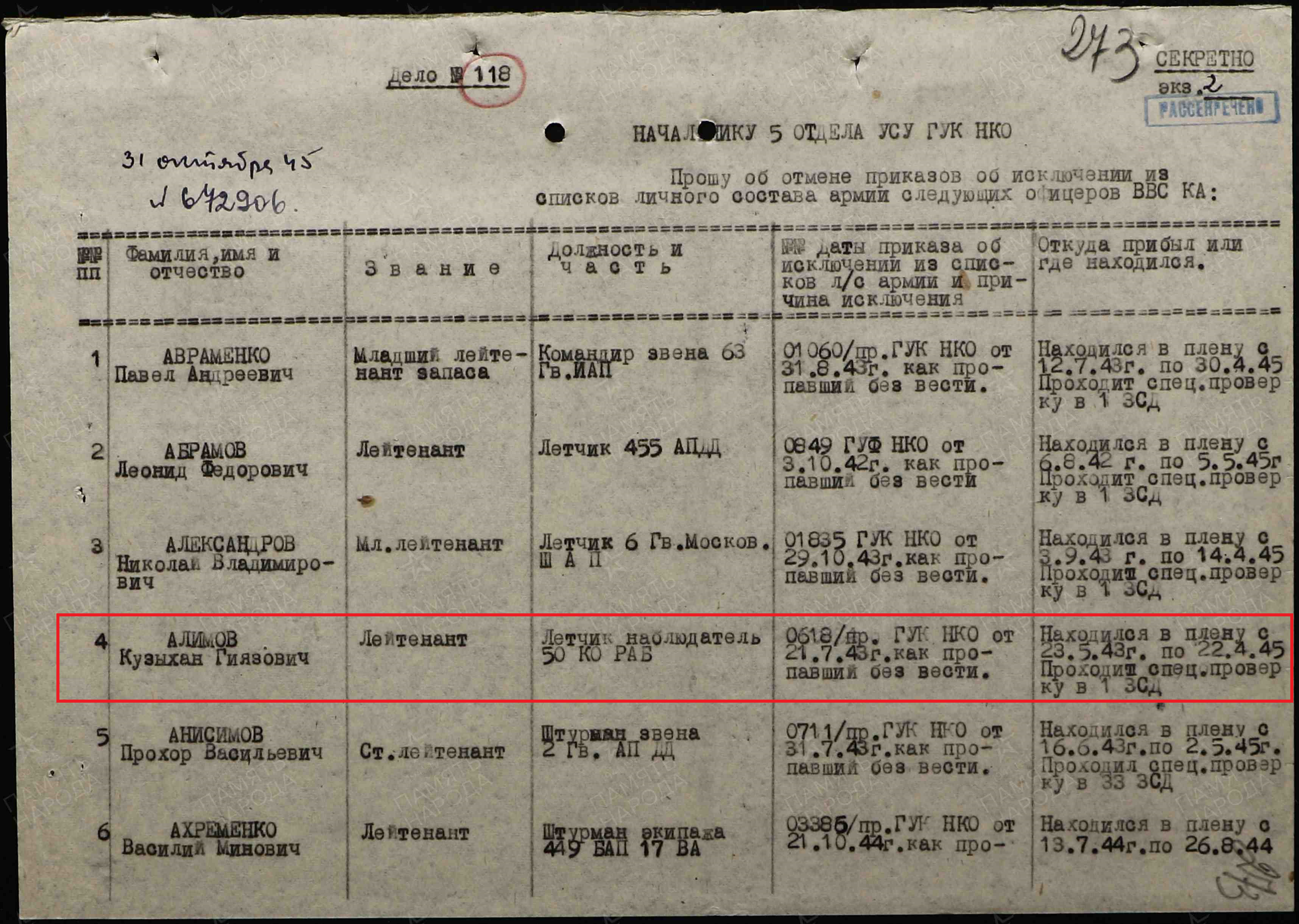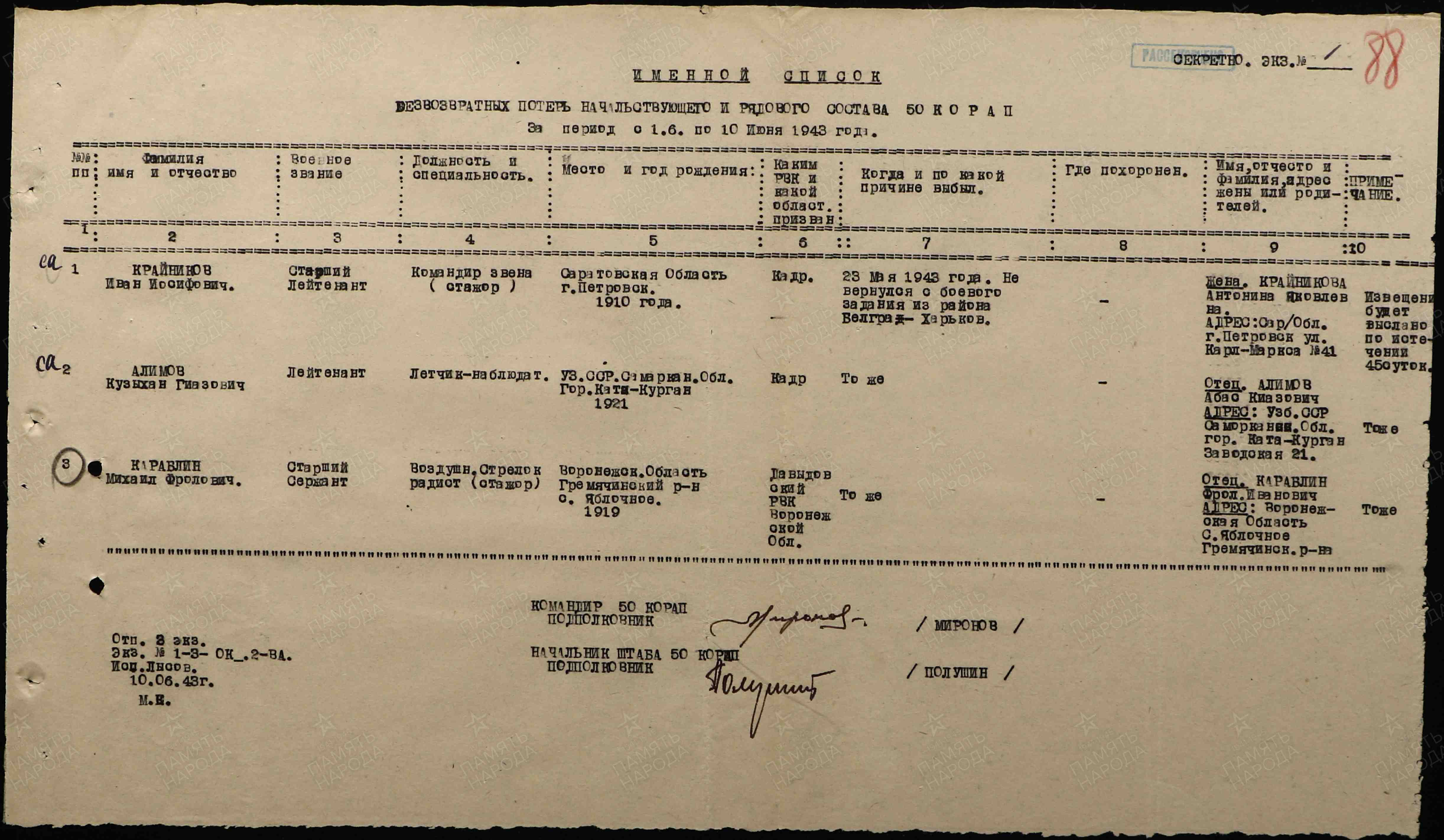 Опубликовано: 18 октября 8 часов назад, катуар сказал: 23.05.43 г. нбз из района Белгород-Харьков экипаж 50 орап в составе: командир звена (стажер) ст. лейтенант Крайников Иван Иосифович, 1910 г.р., уроженец г. Петровск Саратовской обл., летчик-наблюдатель лейтенант Алимов Кузыхан Гиазович, 1921 г.р., уроженец г. Каттакурган Самаркандской обл. Узбекской ССР и стрелок-радист (стажер) ст. сержант Караблин Михаил Фролович, 1919 г.р., уроженец с. Яблочное Гремяченского р-на Воронежской обл. Крайников и Караблин проходили стажировку от 15 орзап и, вероятно, погибли. Алимов попал в плен в р-не с. Микояновка под Белгородом, назвал себя Константином и на допросах пытался дать ложные сведения. Например, свой полк указал как 180-й рап, которого не существовало. В плену выжил. Репатриирован и отправлен на спецпроверку в 1-ю запасную стрелковую дивизию, после чего уволен в запас в декабре 1945 года. 24.09.66 г. был награжден медалью «За отвагу». 1 Упомянуть пользователя Поделиться сообщением Ссылка на сообщение Поделиться на других сайтах