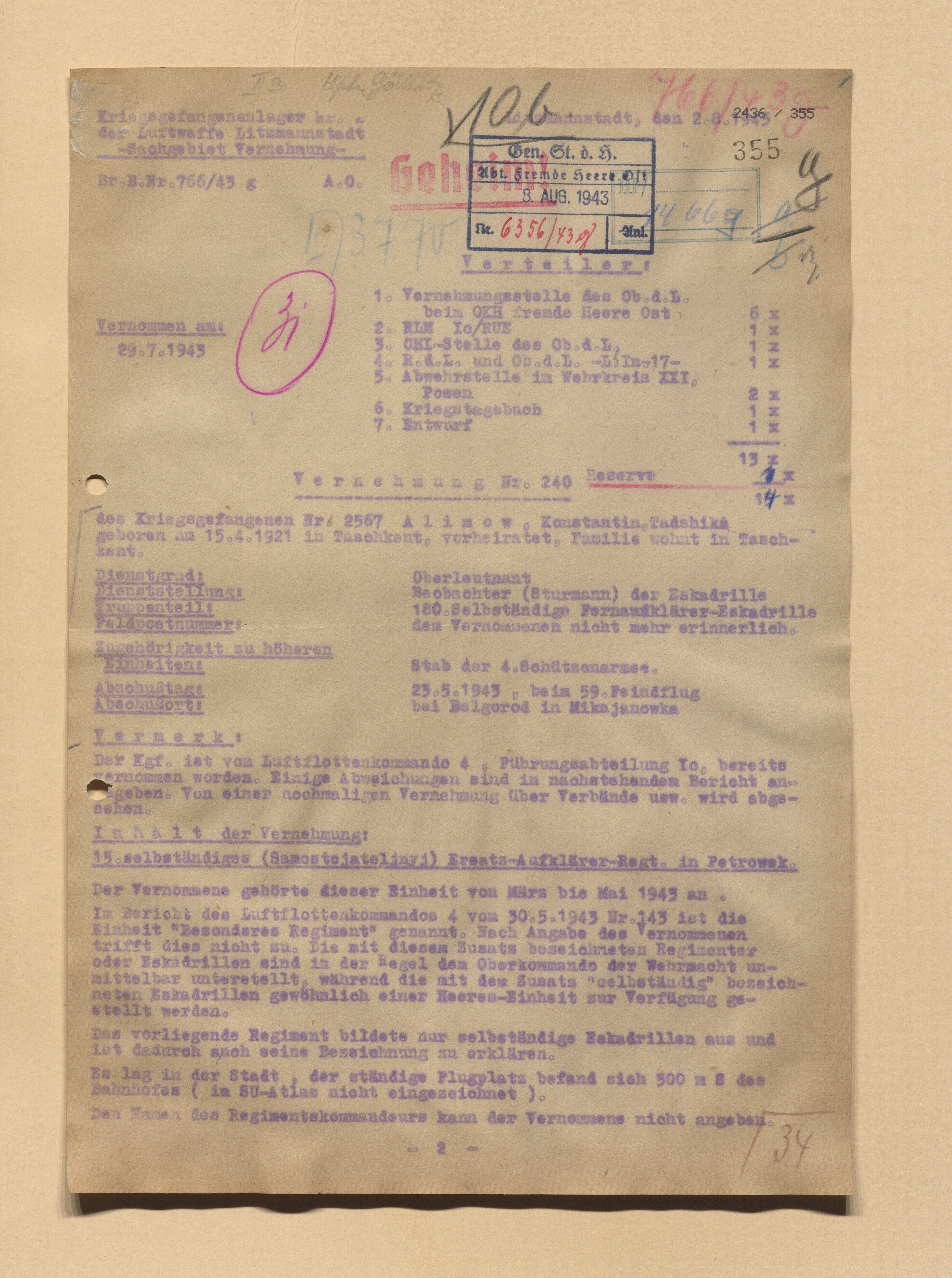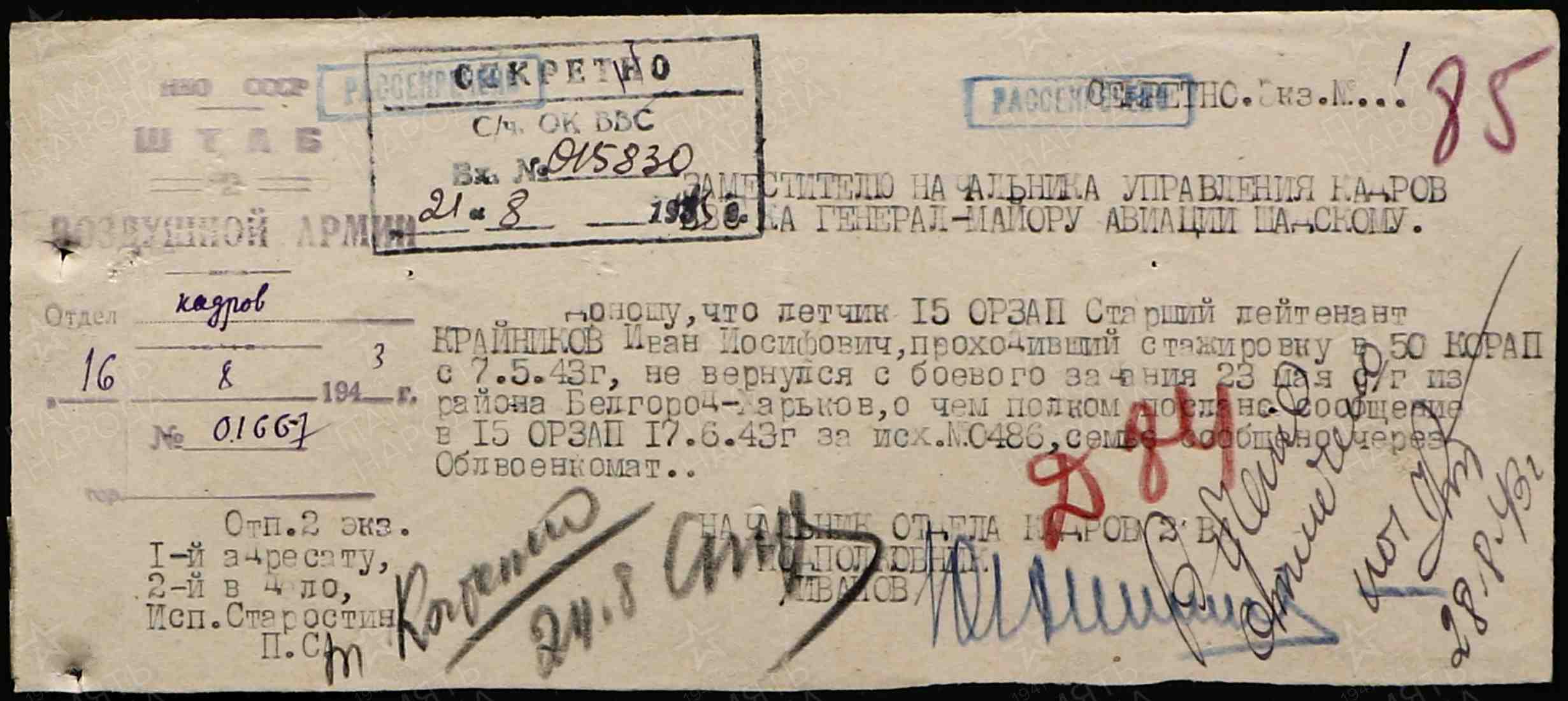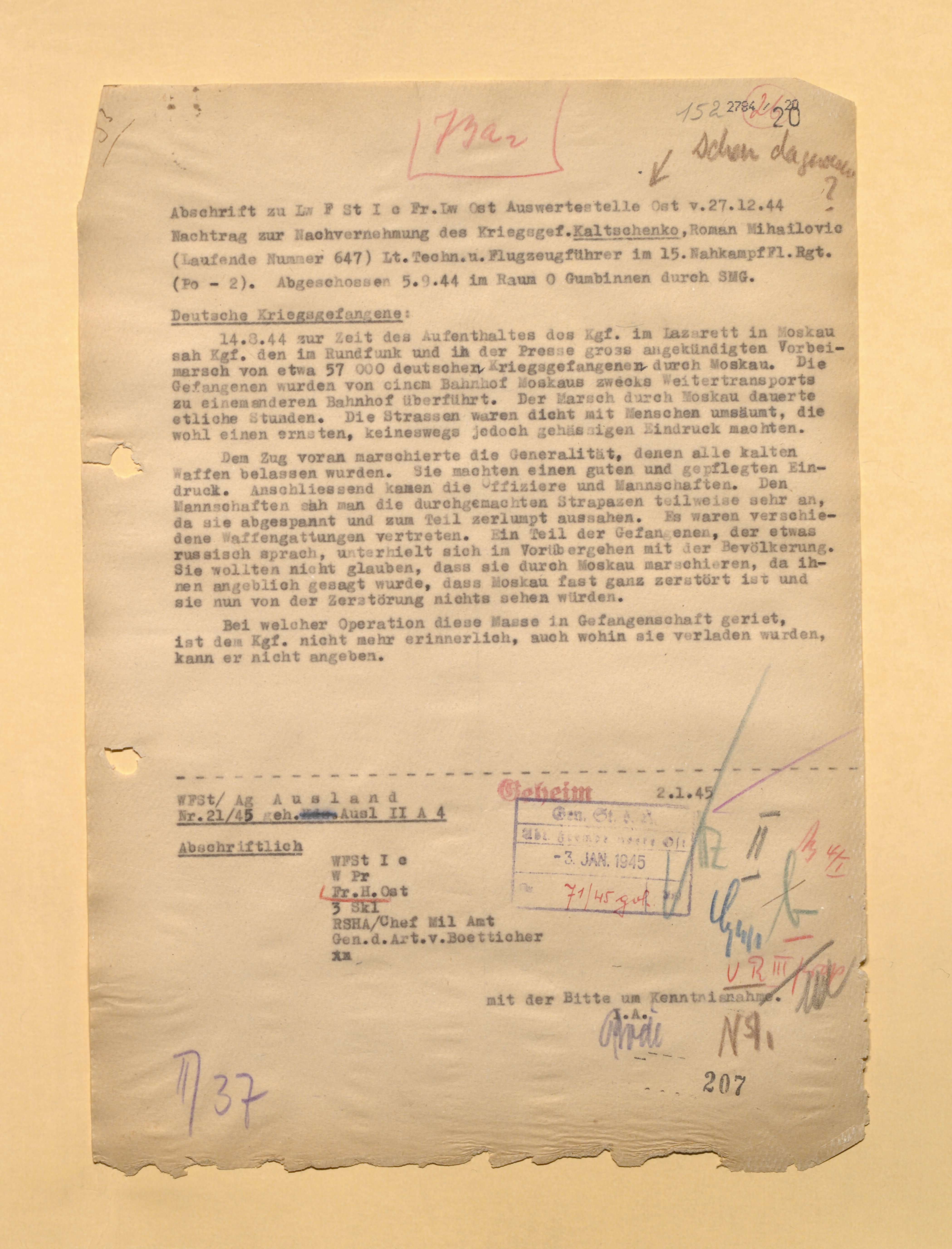 Опубликовано: 24 октября 1 час назад, linnet сказал: У немцев докладная записка от 29.5.1944 со слов военнопленного ефрейтор Александров Александр бортстрелок 881 шап сбитого 13.2.1944. Явная дезинформация! Номер полка, личные данные?, фамилии командиров явно вымышлены. Скорее всего это один из бортстрелков 277 шад потерянных 13.2.1944. Со слов пленного несуществующий 881 шап был в составе 13 ВА и не входил в состав дивизии. А про какое место идет речь (место сбития, пленения) ? За этот день (13.02.44г.) в 277 ШАД большие потери матчасти и личного состава. По воздушным стрелкам из сбитых (подбитых): 3 не вернулись, 3 остались живы после вынужденных посадок 0 Упомянуть пользователя Поделиться сообщением Ссылка на сообщение Поделиться на других сайтах