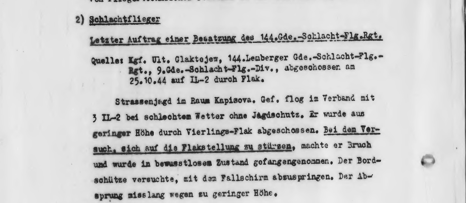 Опубликовано: 19 октября 8 часов назад, катуар сказал: У фрицев – 25.10.44 г. сбит зенитным огнем Ил-2, летчик взят в плен в бессознательном состоянии, бортстрелок пытался выпрыгнуть с парашютом, прыжок не удался из-за слишком малой высоты. У нас – 25.10.44 г. при выполнении боевого задания в районе севернее 3 км Ростоки (Польша) сбит огнем ЗА над целью Ил-2 144 гв. шап 9 гв. шад. Погиб экипаж в составе: летчик гв. мл. лейтенант Глактеев Геннадий Павлович, 1924 г.р., уроженец с. Кубассы Чистопольского р-на Татарской АССР (в некоторых документах фамилия - ГАлактеев) и воздушный стрелок гв. старшина Сеньков Иван Гаврилович, 1919 г.р., уроженец с. Любовша Красногорского р-на Орловской обл. Сеньков*** погиб, а Глактеев попал в плен и выжил. Репатриирован и отправлен на спецпроверку в 1-ю запасную стрелковую дивизию, после чего уволен в запас в декабре 1945 года. Был награжден орденами Отечественной войны I и II степени. *** 28.06.42 г. командир отделения 1 стрелкового батальона 111 стрелковой бригады мл. сержант Сеньков И.Г. из станкового пулемета Максима сбил 2 самолета Ю-88, а 05.07.42 г., обеспечивая выход бригады из окружения, уничтожил около 50 солдат и офицеров противника, за что был представлен к награждению орденом Красного Знамени, однако награда 21.08.42 г. была понижена до ордена Красной Звезды. 15.07.42 г. Сеньков был представлен к награждению и награжден 20.01.43 г., но уже как командир взвода 2-й пульроты 383 сп 121 сд, орденом Отечественной войны I степени за сбитие этих же двух Ю-88 у совхоза Расховец Курской обл. В 144 гв. шап был награжден медалью «За отвагу» за 11 успешных боевых вылетов. 2 Упомянуть пользователя Поделиться сообщением Ссылка на сообщение Поделиться на других сайтах