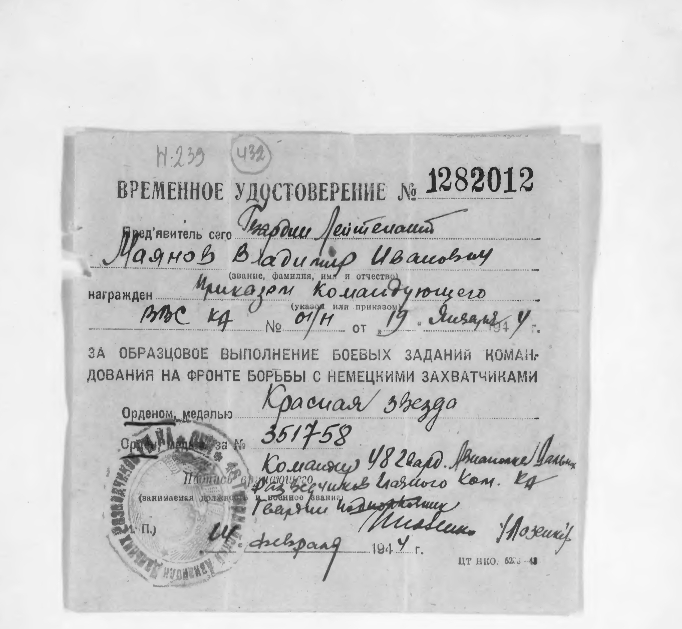 Опубликовано: 22 октября 9 часов назад, катуар сказал: летчик-наблюдатель 48 ограп гв. ст. лейтенант Маянов Владимир Иванович, 1919 г.р., уроженец г. Муром Муромского р-на Горьковской обл. Орденом Красной Звезды был награжден за 30 успешных боевых вылетов на разведку глубокого тыла противника. 21.05.44 г. не вернулся из боевого вылета в район г. Бырлад, Румыния (летчик - гв. мл. лейтенант Сакеев Дмитрий Васильевич, 1918 г.р., уроженец г. Иланск Красноярского края, стрелок-радист - гв. ст. сержант Дмитриев Константин Павлович, 1922 г.р., уроженец г. Астрахань). 1 Упомянуть пользователя Поделиться сообщением Ссылка на сообщение Поделиться на других сайтах