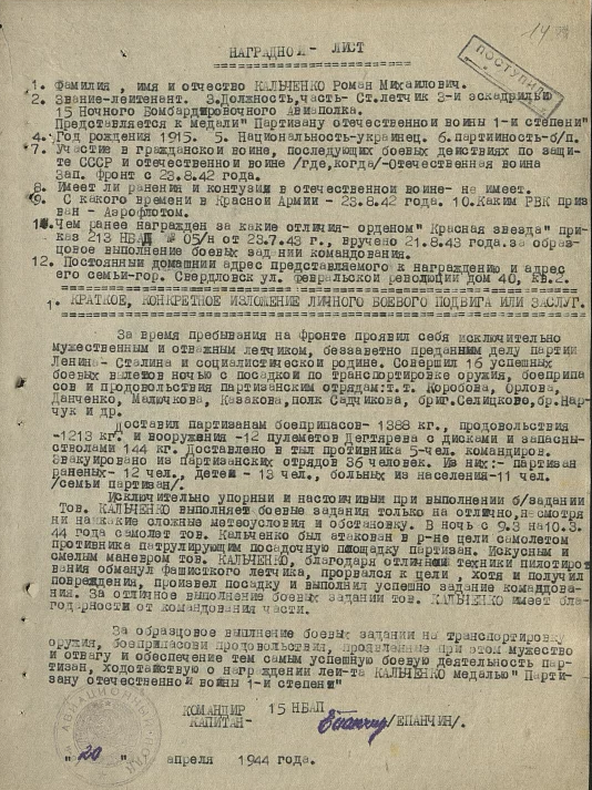Опубликовано: 23 октября Тоже дополню. 20.04.44 г. лейтенант Кальченко Роман Михайлович был представлен к награждению медалью «Партизану Отечественной войны» I-й степени: 1 Упомянуть пользователя Поделиться сообщением Ссылка на сообщение Поделиться на других сайтах
