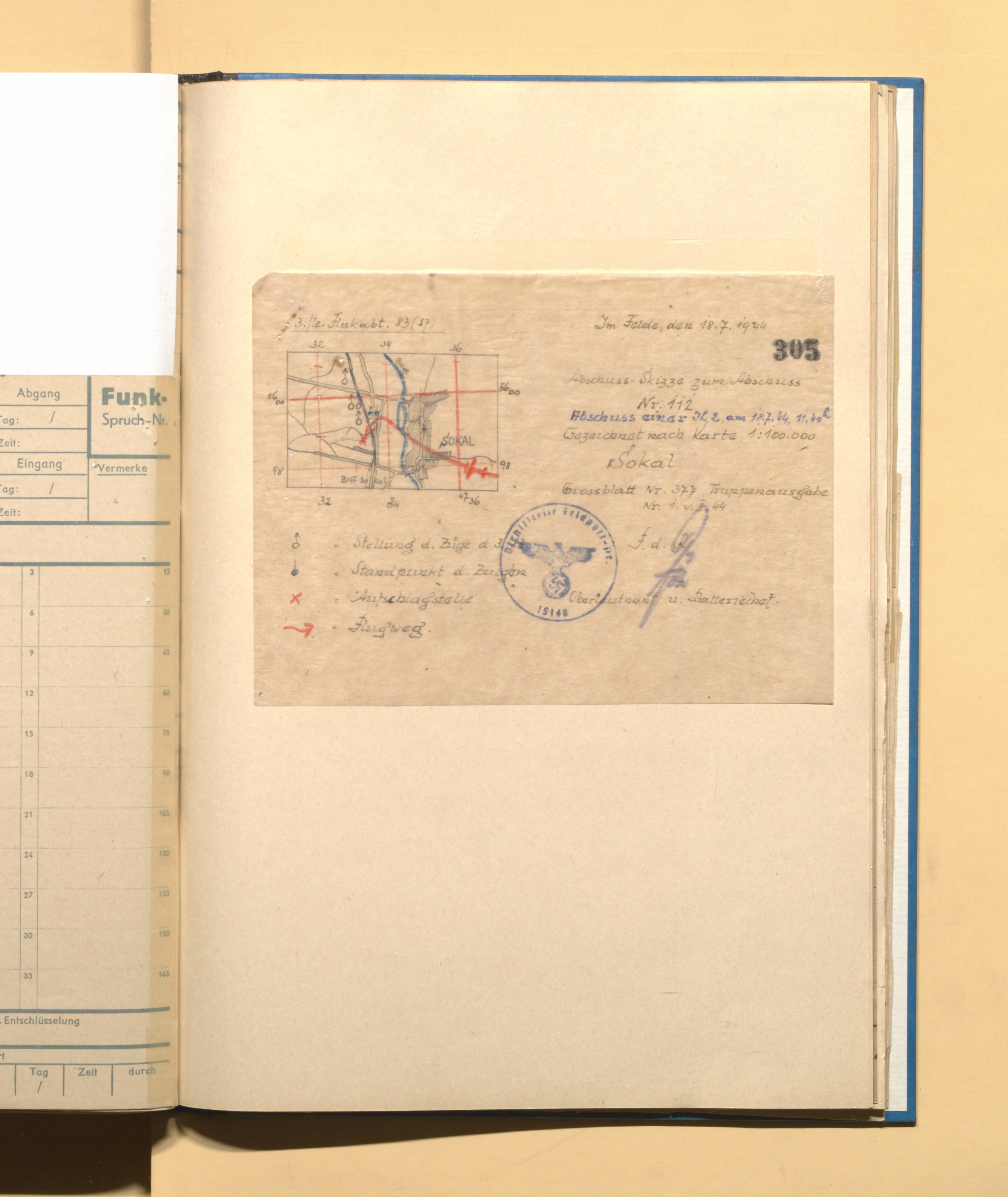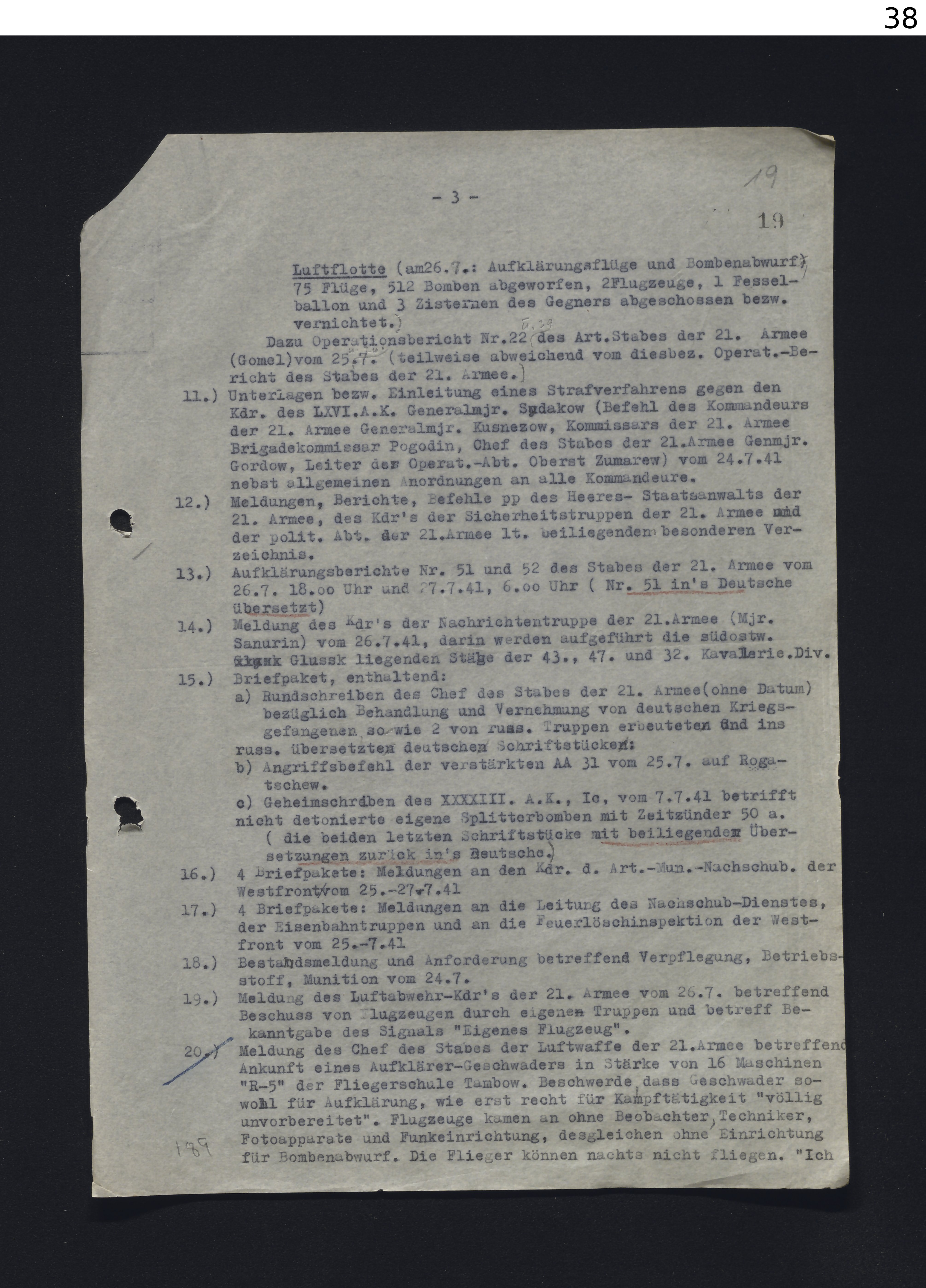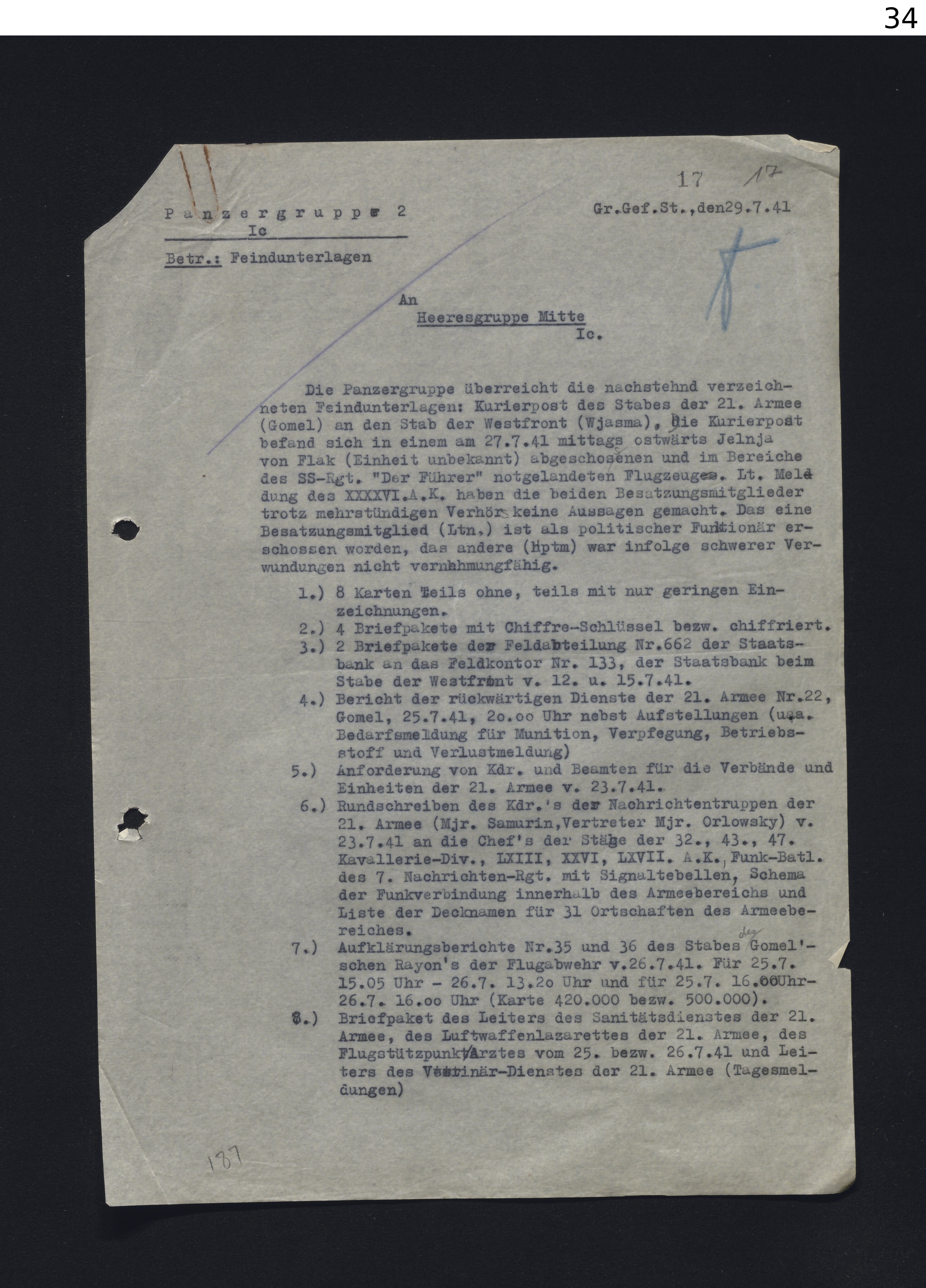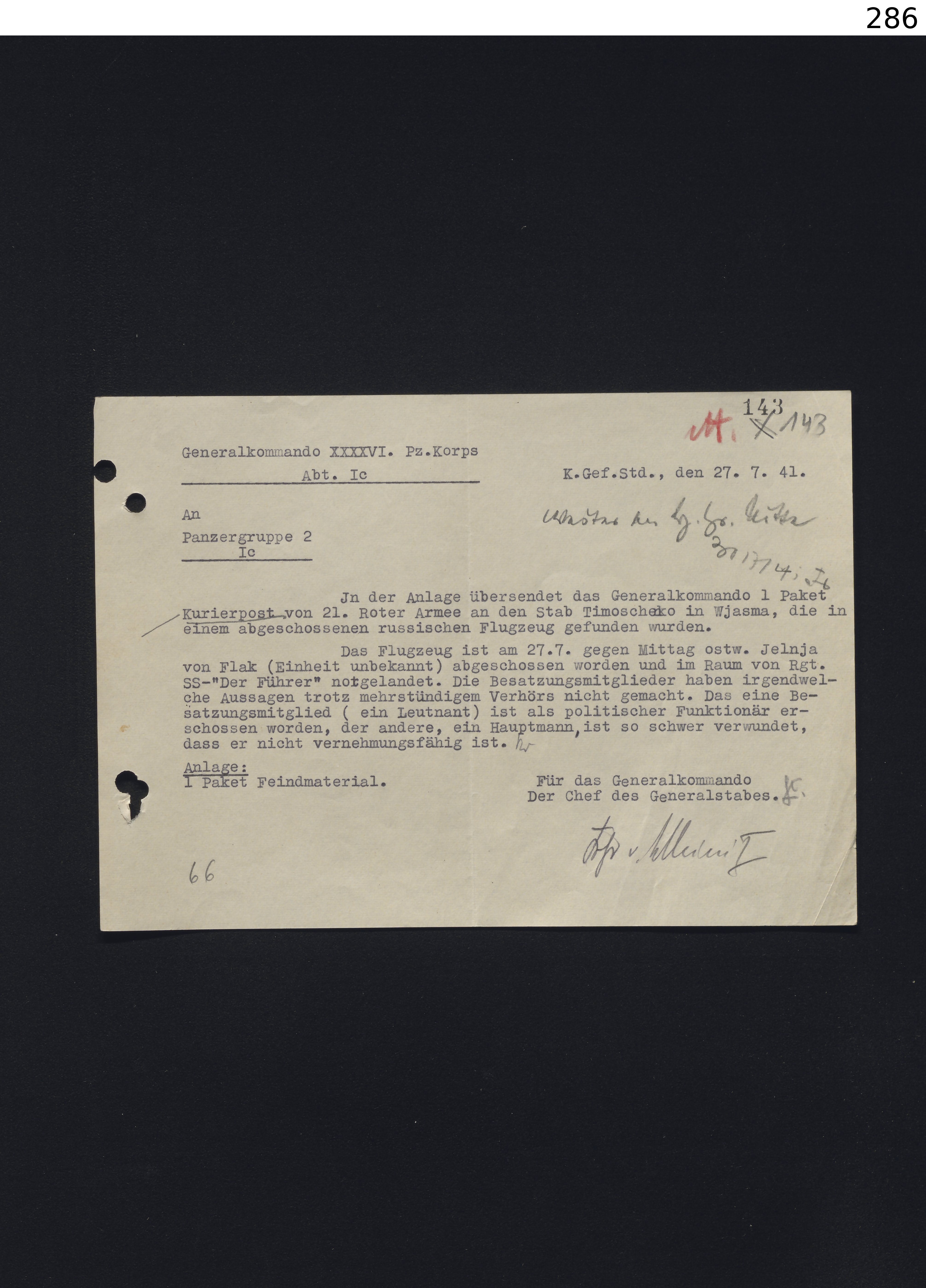 Немецкая сопроводиловка на пакет, найденный в сбитом самолете. Я так понимаю, пакет был из штаба 21 армии в штаб Тимошенко в Вязьме. Самолет сбит ЗА 27.7.1941 около полудня и сел вынужденно в районе Ельня в расположении полка СС Дер Фюрер. Члены экипажа не дали никаких показаний, несмотря на многочасовые допросы. Один член экипажа (лейтенант) был застрелен как политический деятель, другой, капитан, ранен так тяжело, что не может быть допрошен.