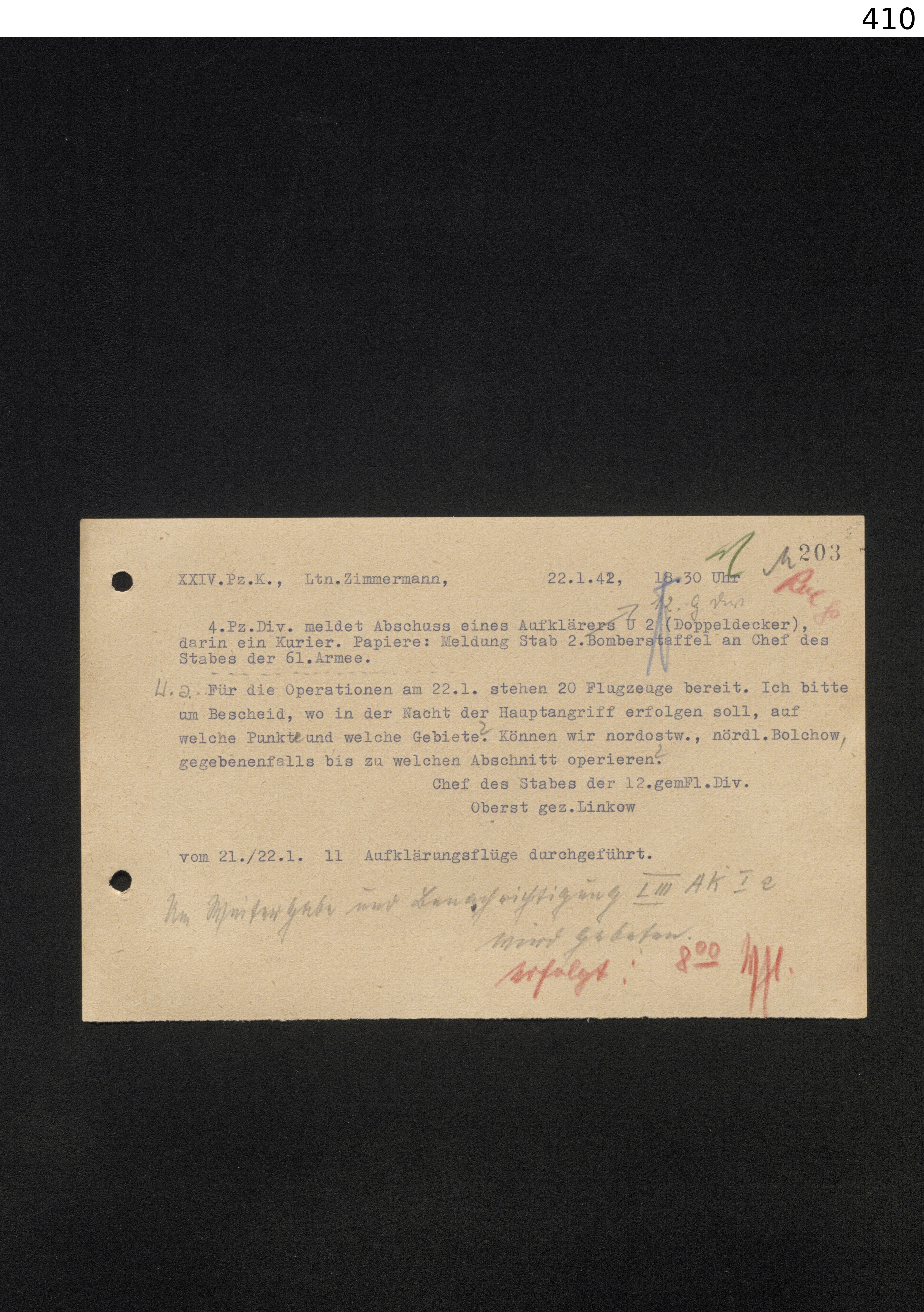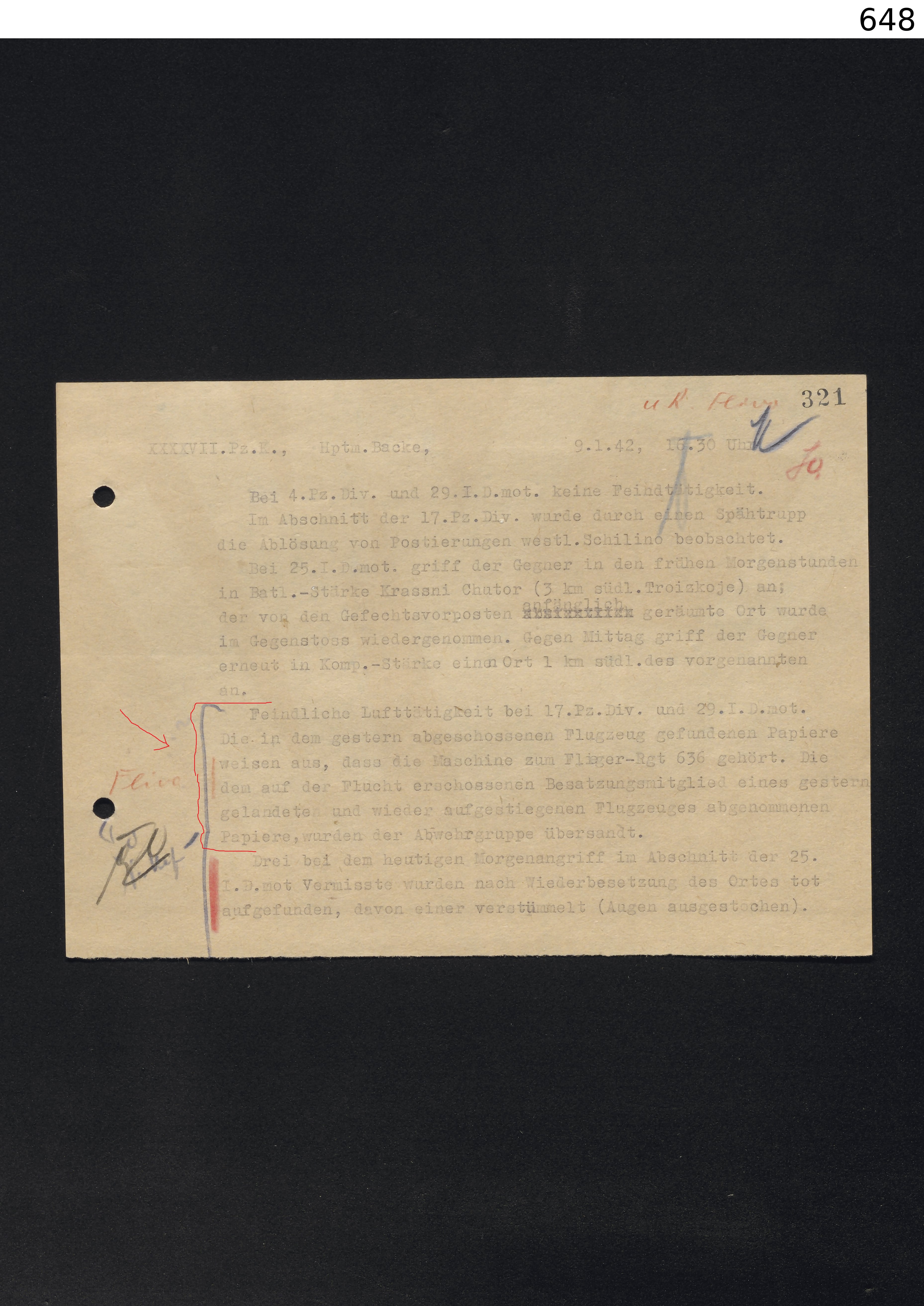 У фрицев – 08.01.42 г. сбили наш самолет. Документы, найденные в нем, указывают на то, что машина принадлежит 636 авиаполку. Документы, изъятые у застреленного члена экипажа, были переданы абвергруппе.