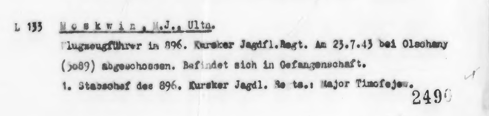 У немцев: упоминание военнопленного мл. л-т Москвин М. летчик 896 иап. Сбит/взят в плен (?) 23.7.1943 в районе Ольшаны