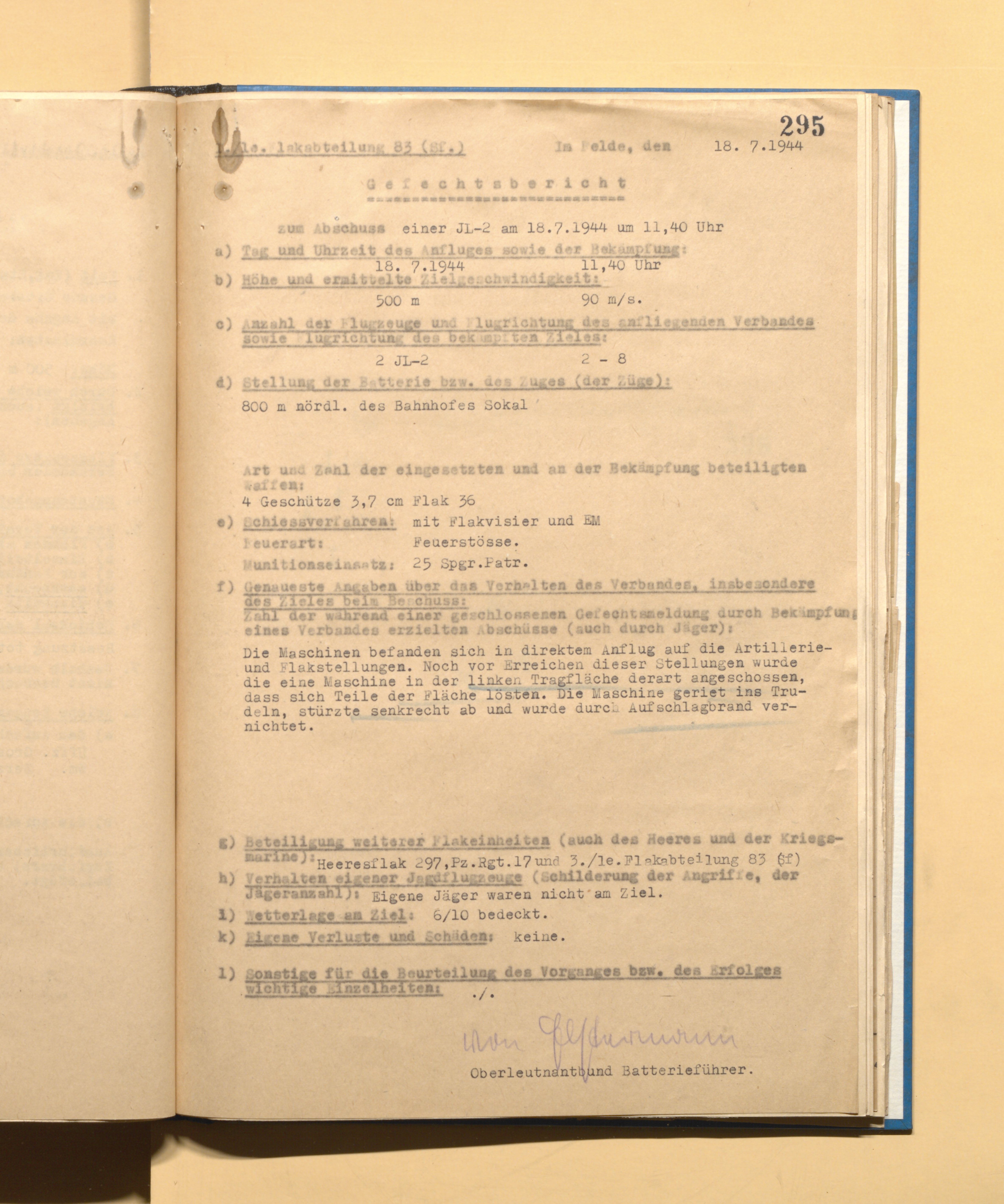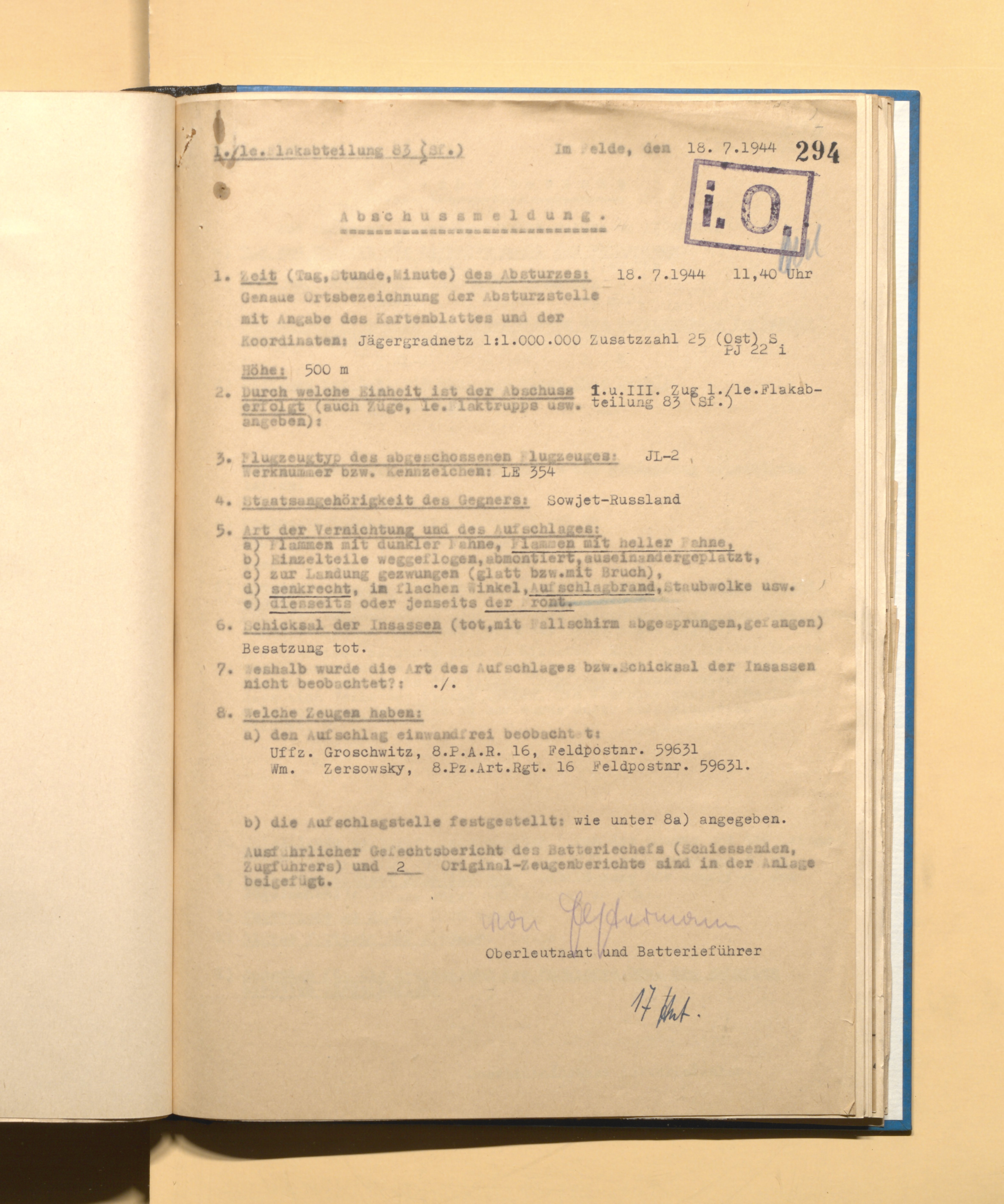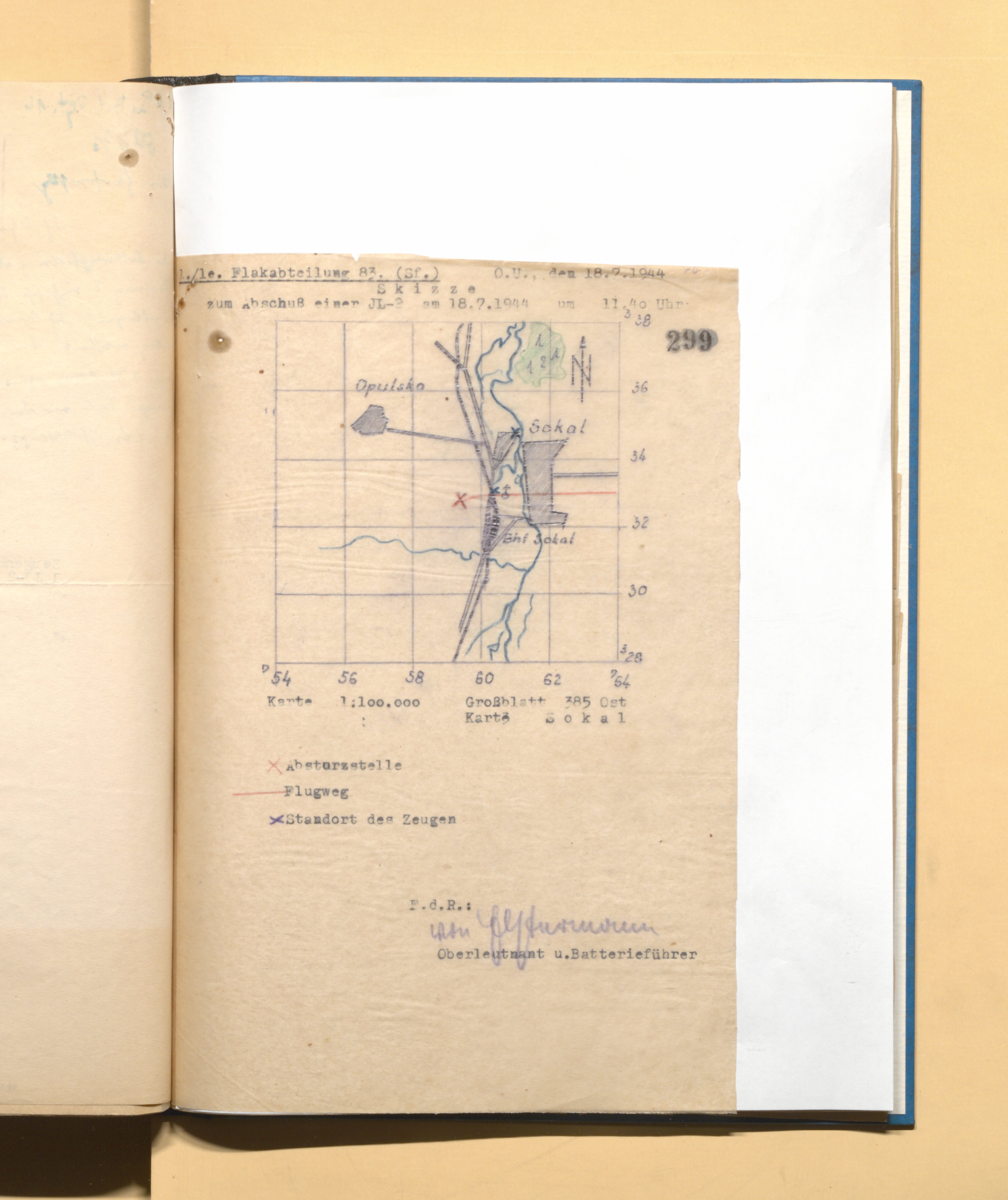 У фрицев – в 11.40 18.07.44 г. западнее г. Сокаль (Львовская обл.) до подхода к зенитным позициям сбит зенитным огнем Ил-2, части самолета оторвались, машина упала вертикально и сгорела в результате удара, экипаж погиб.