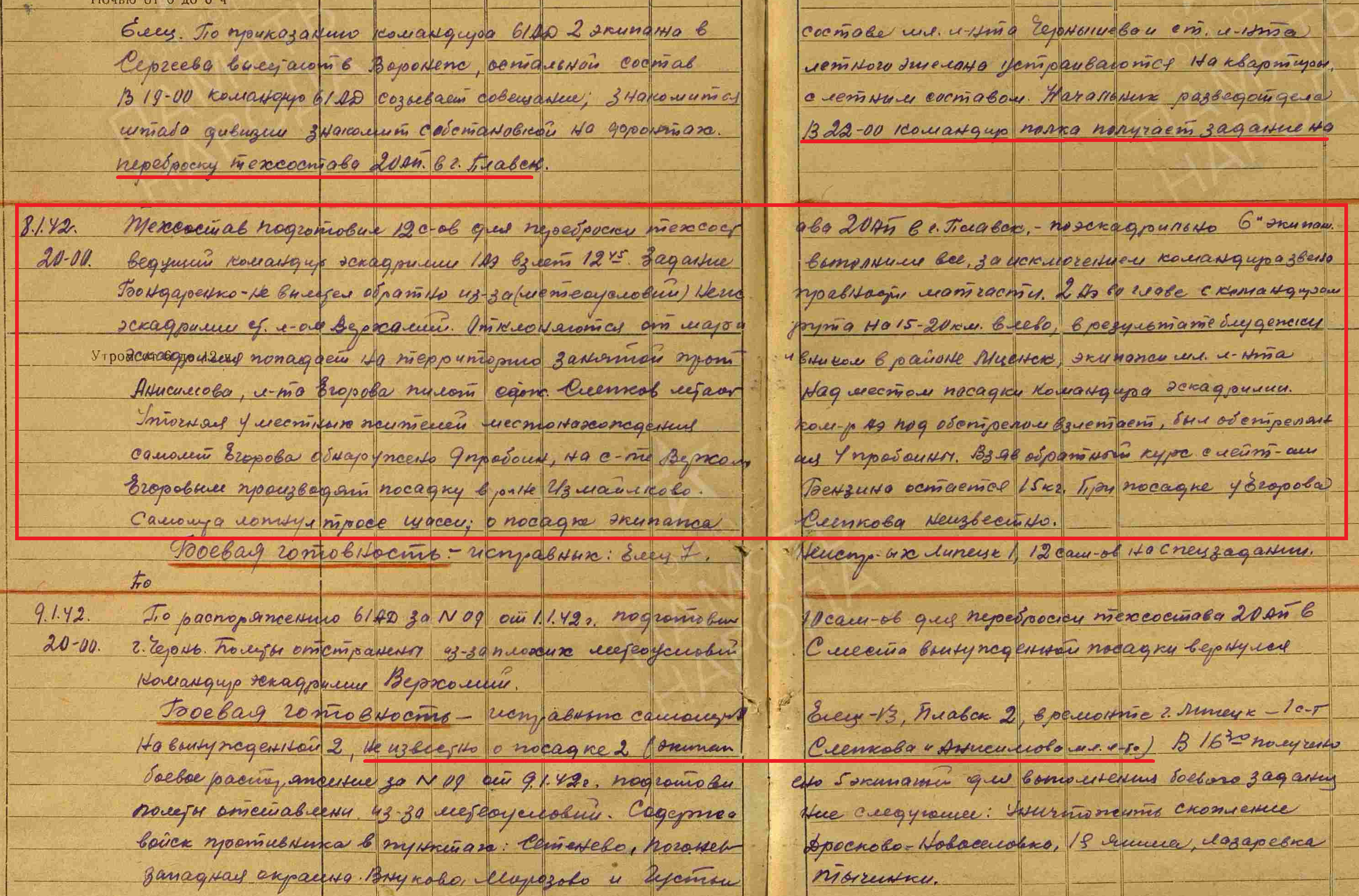 08.01.42 г. по приказу командира 61 авд, 636 лбап* на 12 самолетах У-2 осуществлял поэскадрильно переброску техсостава 20 иап (с 18.01.42 г. - 744 иап) на аэродром г. Плавск. 2-я АЭ во главе с командиром эскадрильи ст. л-том Верхомий Т.Г. отклонилась от маршрута на 15-20 км влево и в результате блудежки попала на территорию занятую противником, в районе Мценск. Экипажи: мл. л-та Анисимова, л-та Егорова С.В. и сержанта Слепкова стали летать над местом посадки командира АЭ, который уточнив у местных жителей место нахождения, взлетает под обстрелом. Взяв обратный курс, Верхомий с Егоровым производят ВП в р-не Измайлково, бензина остается 15 кг. О посадке экипажей Анисимова и Слепкова неизвестно.