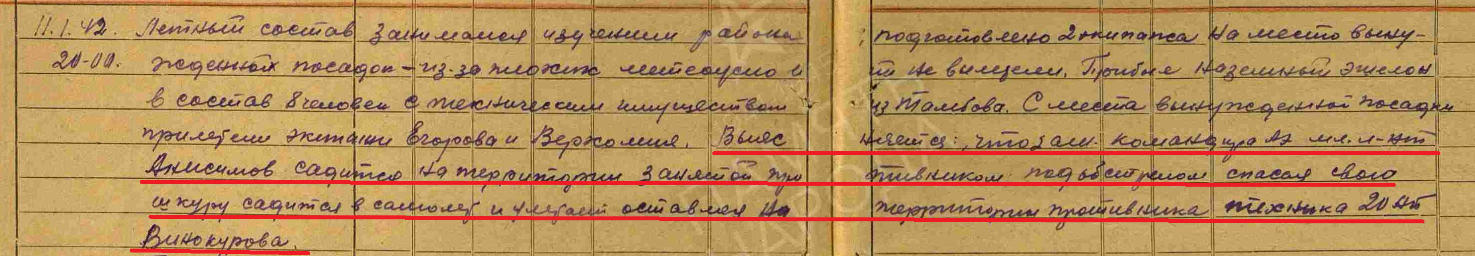 09. и 11.01.42 г. с места ВП прилетели экипажи Верхомия и Егорова. «… Выясняется, что зам. командира АЭ мл. л-т Анисимов садится на территорию занятую противником, под обстрелом спасая свою шкуру садится в самолет и улетает, оставляя на территории противника техника 20 ап Винокурова…».