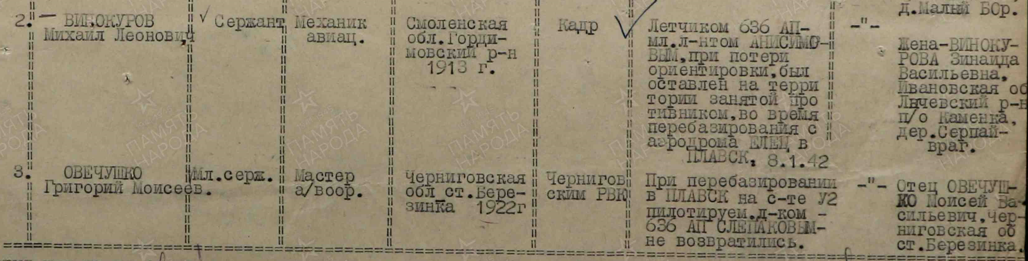 - механик авиационный 20 иап сержант Винокуров Михаил Леонидович (Леонович), 1913 г.р., уроженец Кардымовского р-на Смоленской обл. Летчиком 636 ап мл. л-том Анисимовым, при потере ориентировки, был оставлен на территории занятой противником, во время перебазирования с аэродрома Елец в Плавск 08.01.42 г.