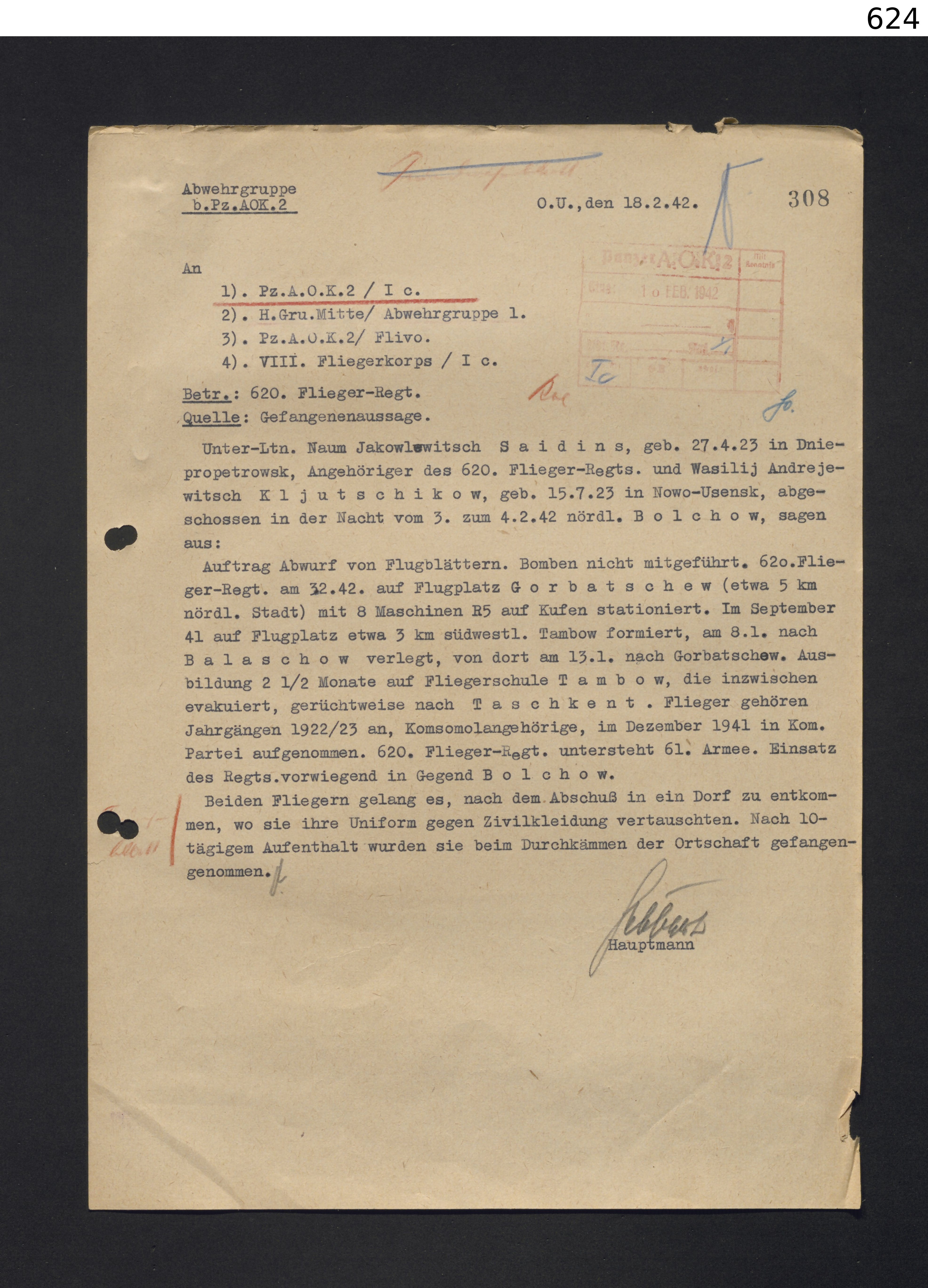 У немцев: данные по экипажу Р-5 620 ап, сбитого в ночь с 3 на 4.2.1941 севернее Болхов. мл. л-т Зайдис Наум Яковлевич летчик, 1923 г.р., Днепропетровск . Ключиков Василий Андреевич штурман 1923 г.р. Ново-Узенск. Экипаж скрылся, переоделся в деревне в гражданскую одежду. Схвачены через 10 дней при прочесывании местности.