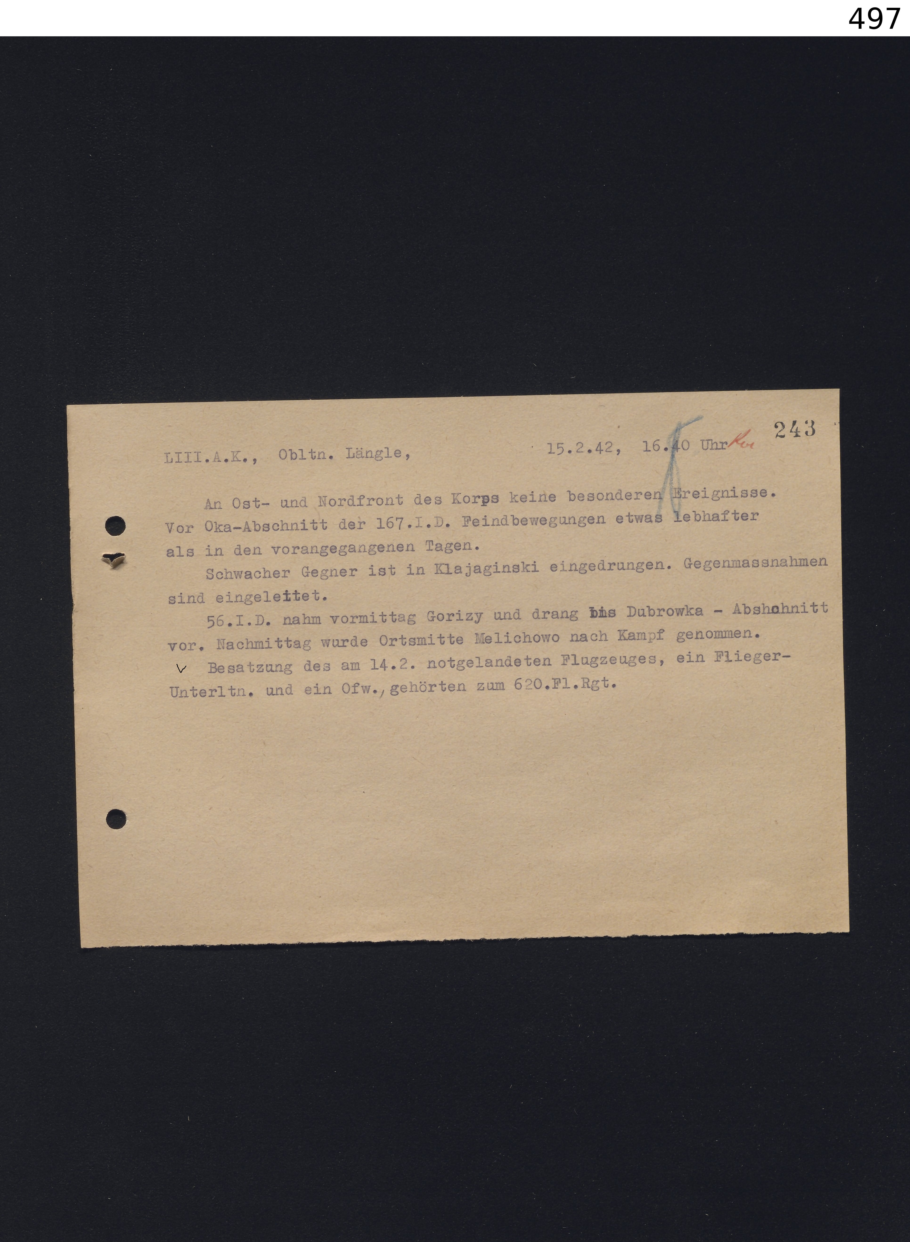681 АП в составе ВВС 10-й армии , в Опер.сводке за 15.02.1942 г, указано полк в течении ночи с 14 на 15 февраля  боевых вылетов не проводил в виду плохих  метеоусловий.