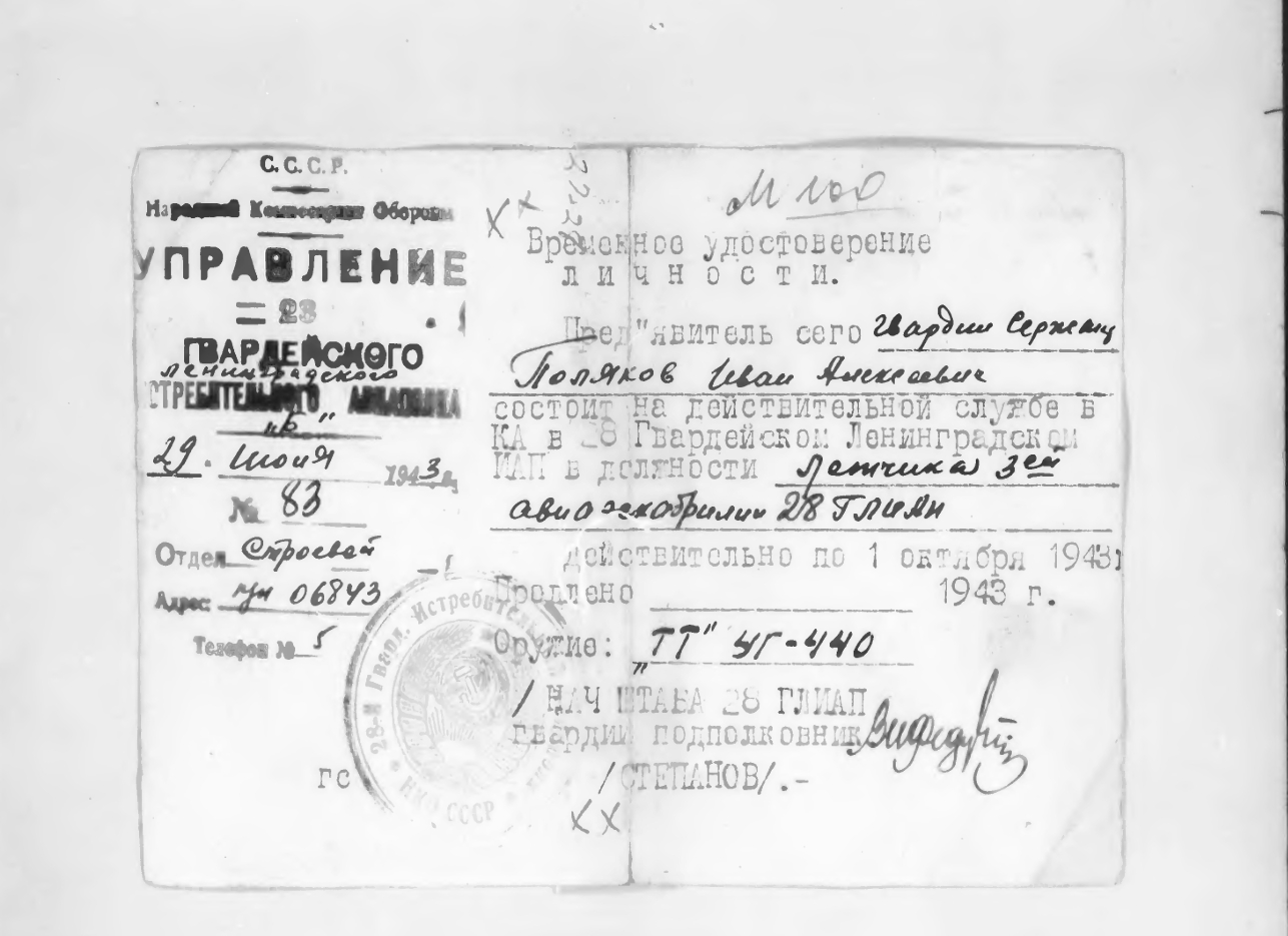 У немцев: временное удостоверение личности гв. с-т Поляков Иван Николаевич летчик 28 гв. иап