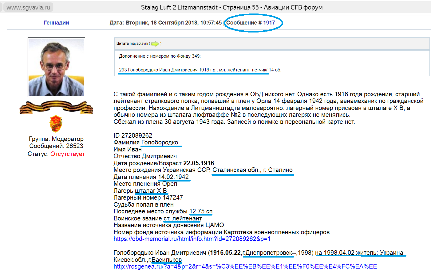 Например, в списке летчиков, заключенных фрицами в Орловскую тюрьму, под № 293 есть ГолобородЬко Иван Дмитриевич 1918 г.р., мл. лейтенант, летчик. Вот результат поиска по нему от Геннадия Кушелева: