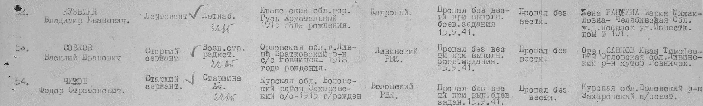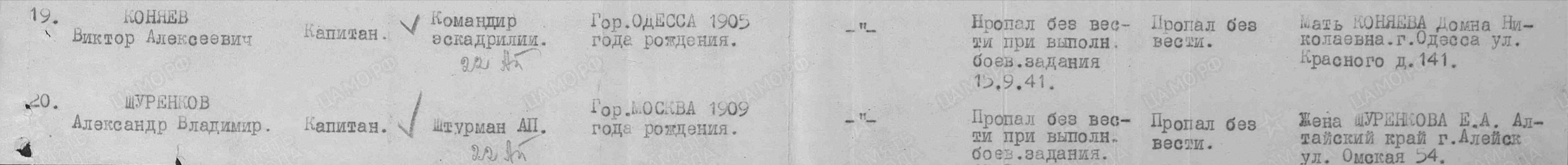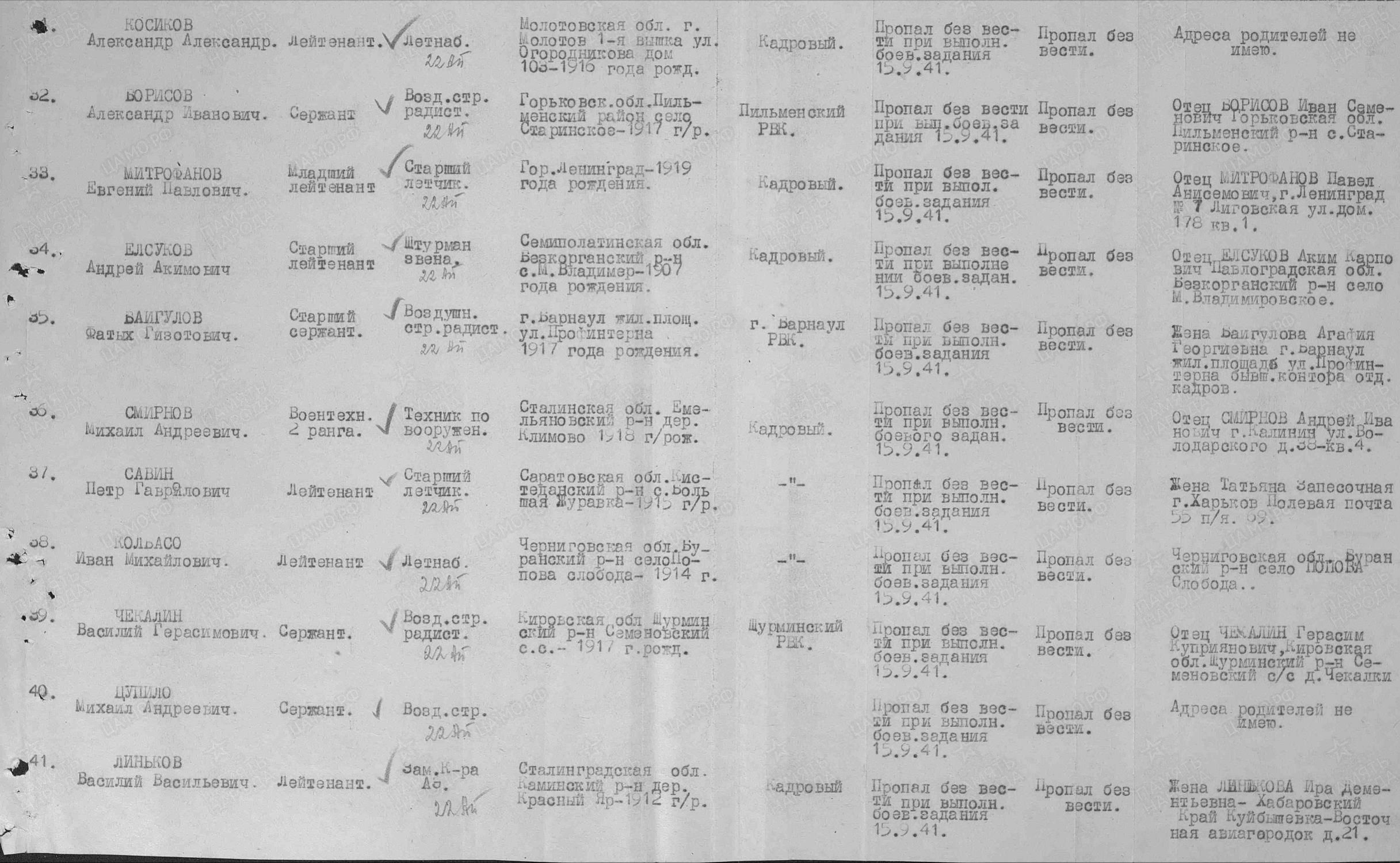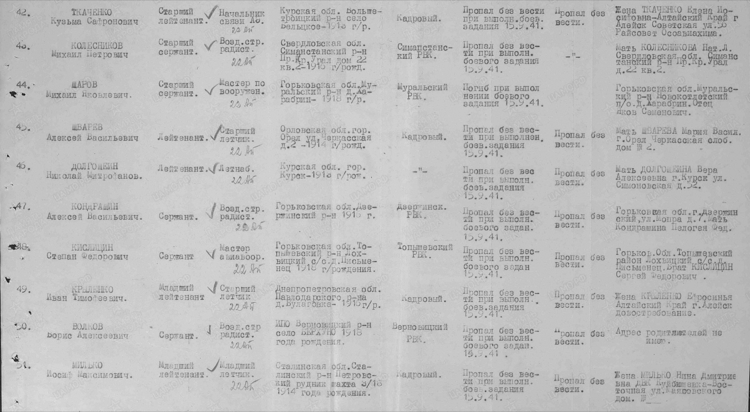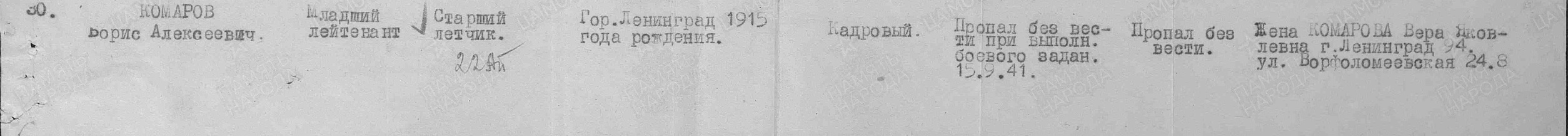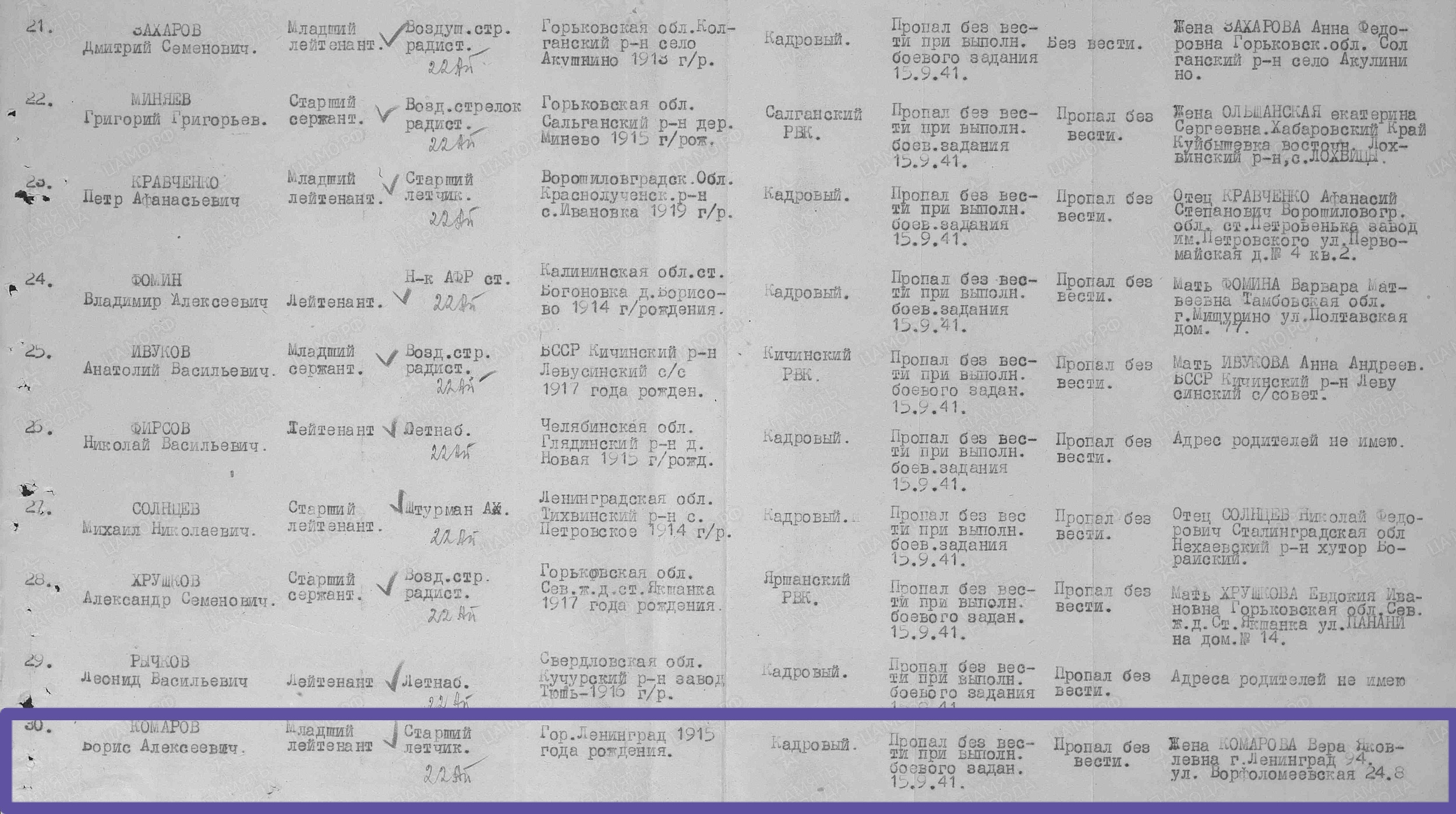 Один из них мл. лейтенант старший лётчик Комаров Борис Алексеевич (д. р. 06.11.1915, г. Ленинград — 15.09.41, нбз в р-не г. Конотоп):