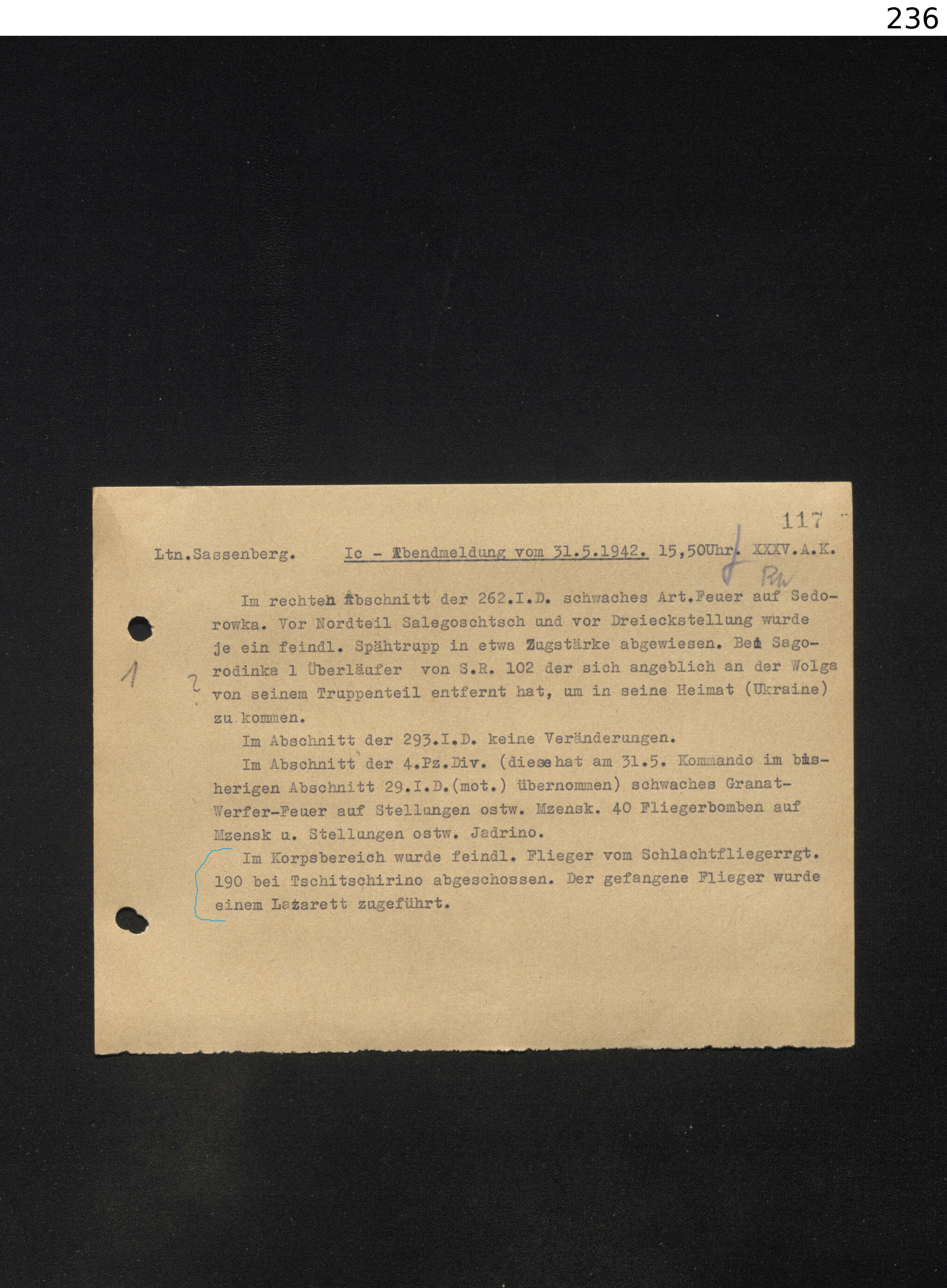 Опубликовано: Sunday в 21:16 (изменено) В 29.11.2025 в 17:30, linnet сказал: У немцев: по 31.5.1942 летчик 190 шап сбит у "Чичирино". Захваченный летчик отправлен в лазарет. У нас: в 190 шап есть подходящие две потери 30.5.1942. Радус и Кабанов район Орел мл л-т Кабанов Виктор Федорович нбз во время второго вылета 10.55 на аэродромы Орел-Оптуха. Судьба неизвестна. л-т Радус Андрей Максимович нбз во время первого вылета 4.25 на аэродром Орел, сбит ЗА. Попал в плен несколько раз бежал. Убит при побеге 4.7.1944. Скорее всего у немцев имелся в виду Радус. Думка, что вариант с Кабановым более вероятен. Ранее в теме рассматривали протокол допроса лейтенанта Радуса - Если правильно перевел - Радус совершил аварийную посадку 30.5.42 г. в Болхов. Это 50 км севернее Орла. "Чичирино" - есть такая деревня 35 км восточнее Орла. Изменено Monday в 23:49 пользователем Барсс 1 Упомянуть пользователя Поделиться сообщением Ссылка на сообщение Поделиться на других сайтах