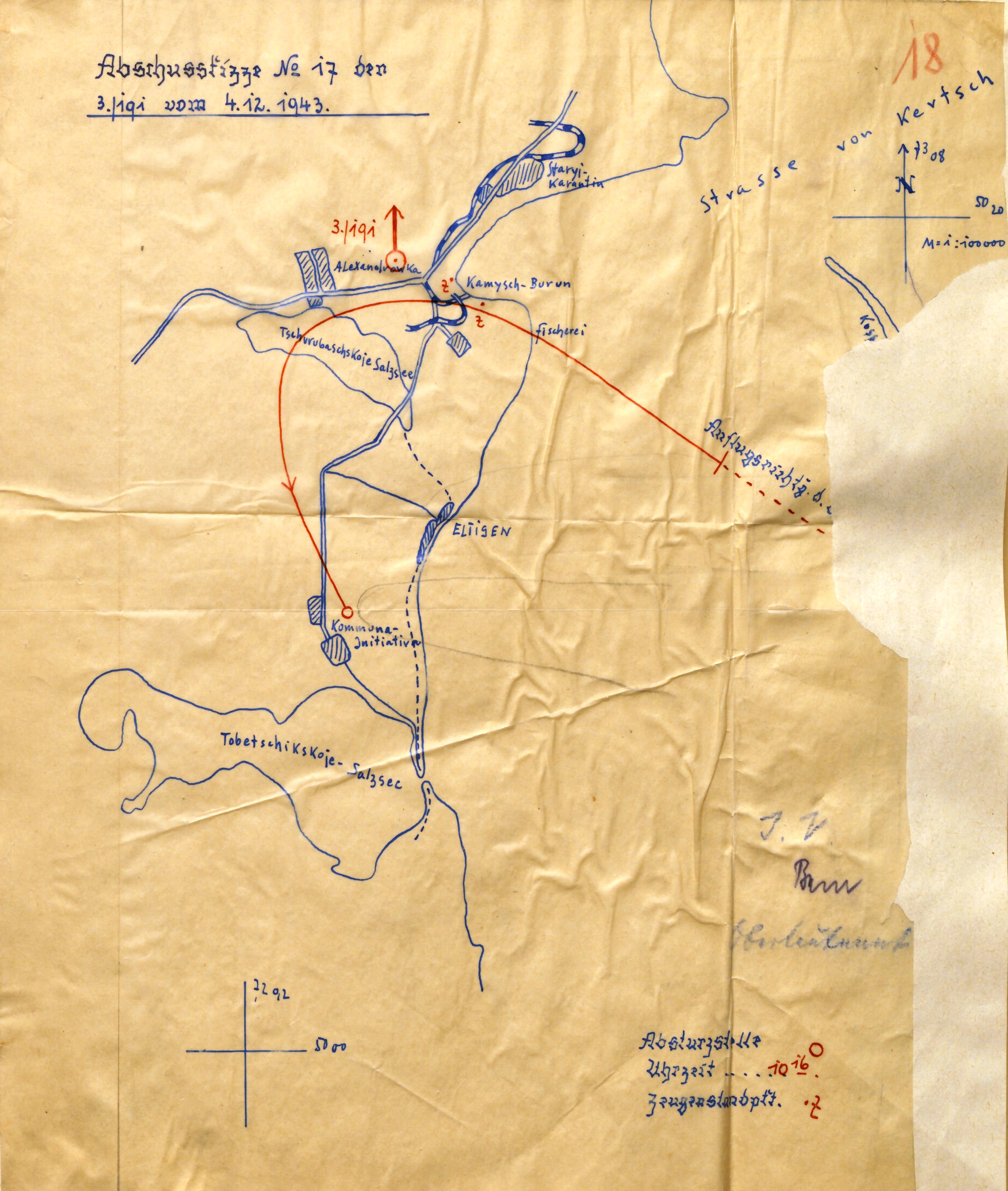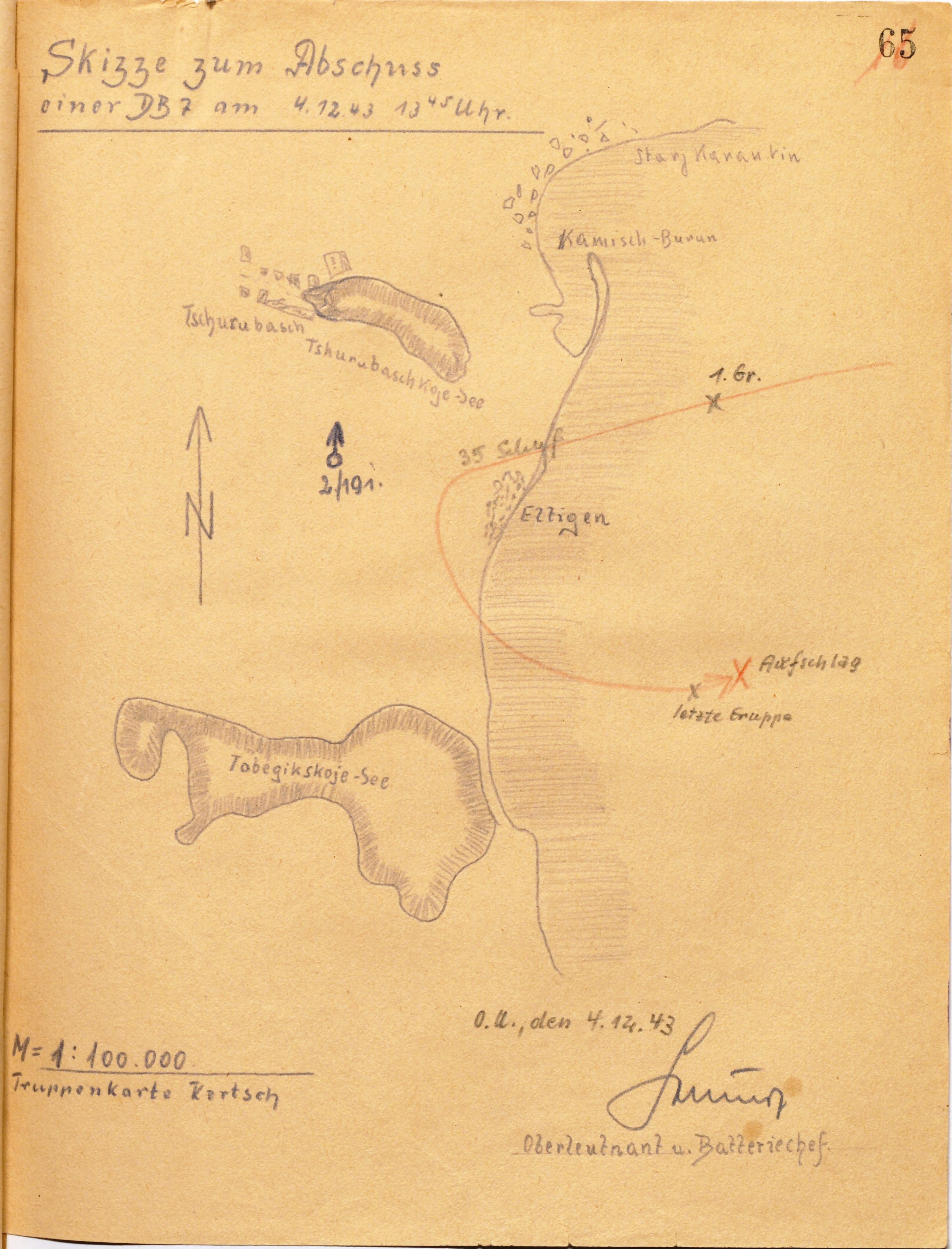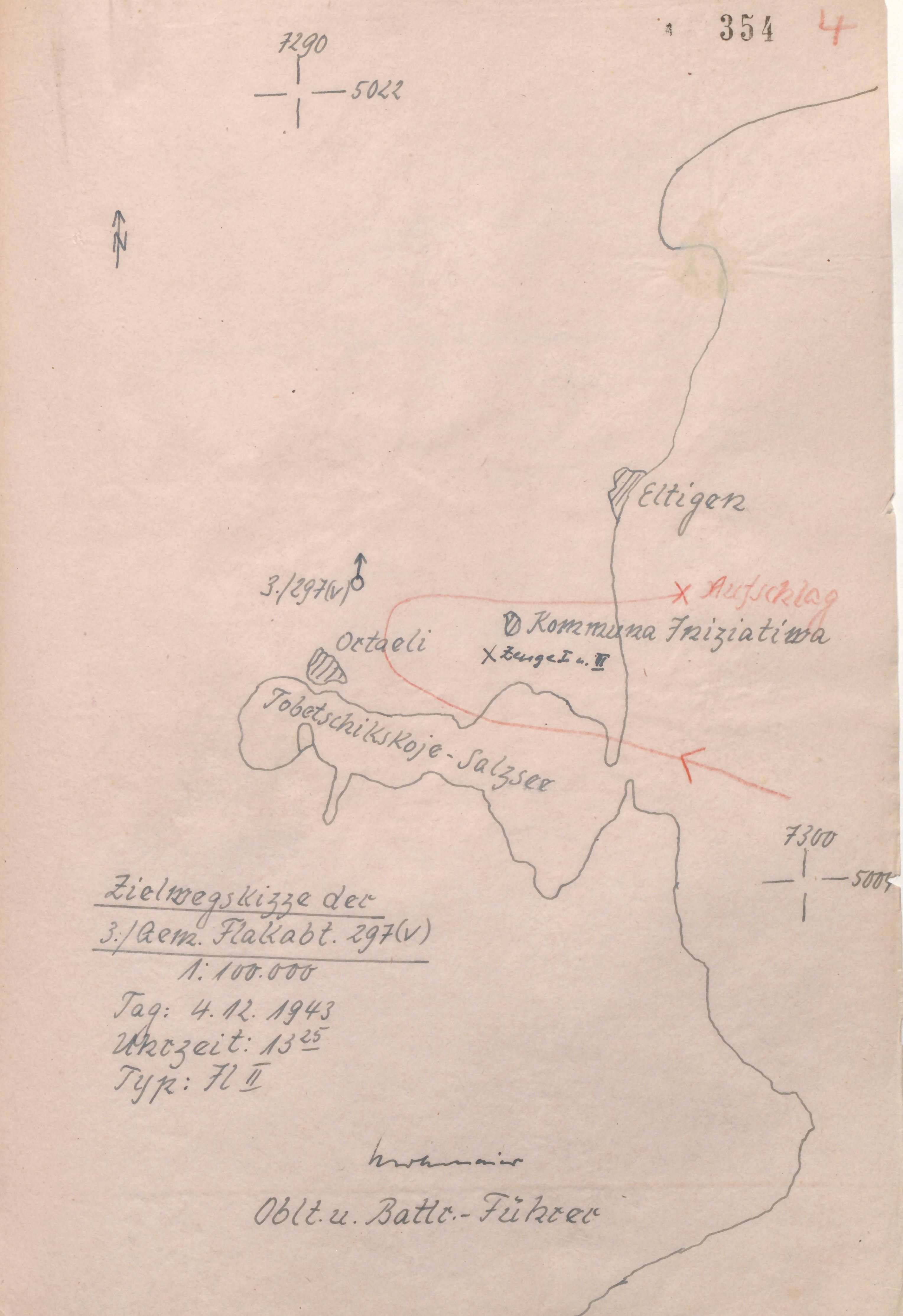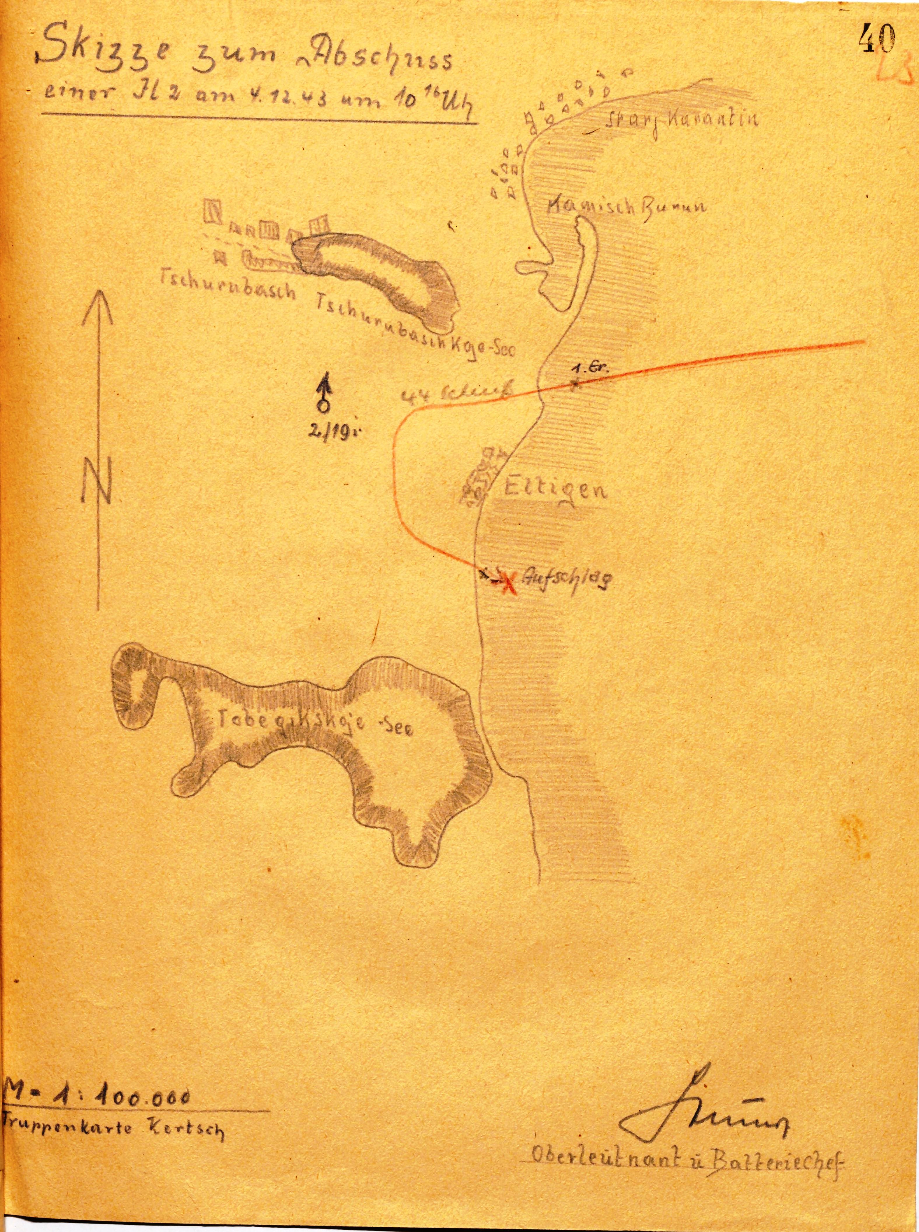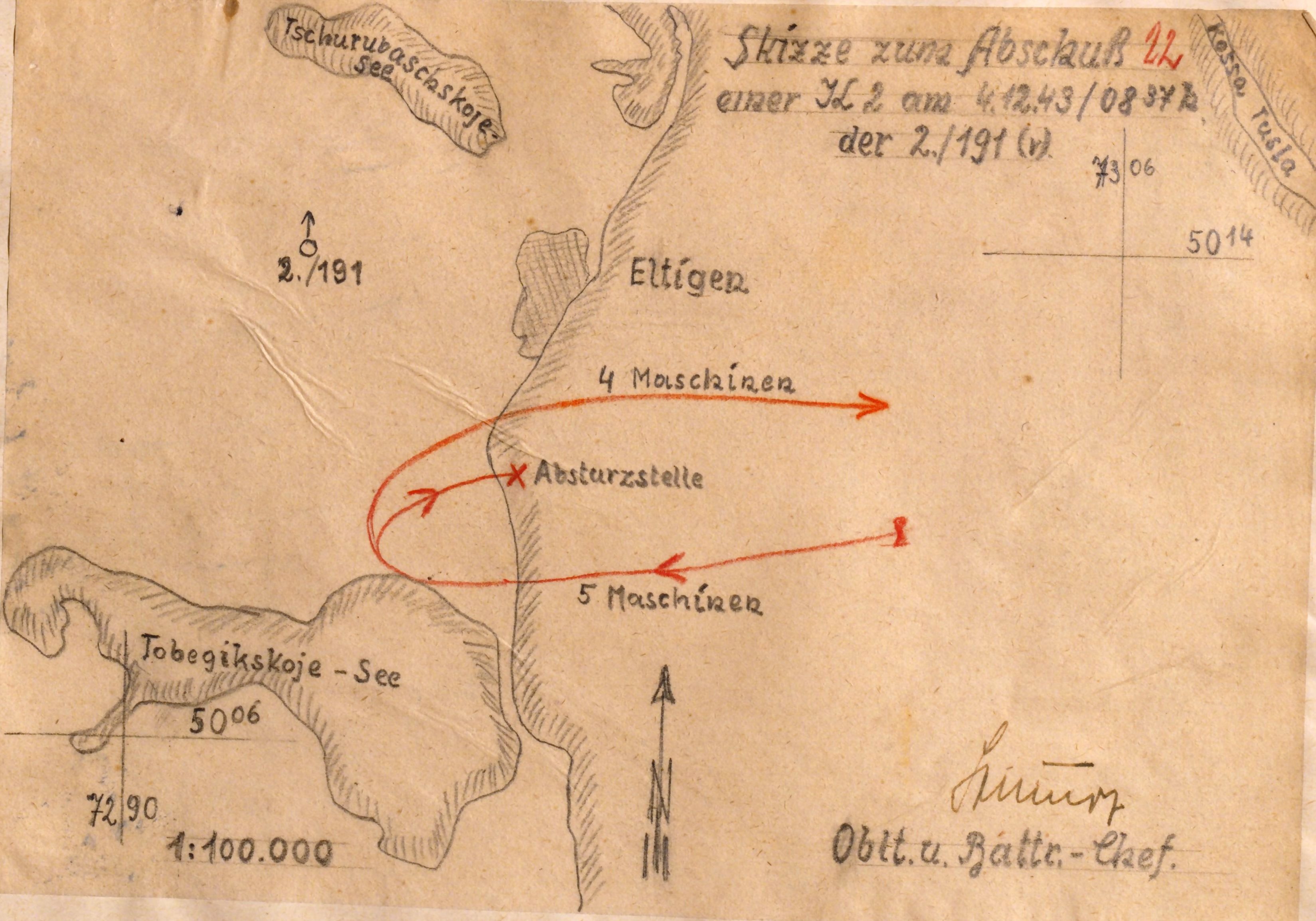Опубликовано: Saturday в 13:40 17 минут назад, skylark сказал: Тоже Керченско-Эльтигенская операция и также слишком мало информации с обеих сторон для установления экипажа. У фрицев – заявляют о сбитии Ил-2 04.12.43 г. в 13.10 3 km sudlich Shcule Eltigen (южнее Школы Эльтиген?) У нас – 04.12.43 г. было несколько потерь Ил-2 в районе пос. Эльтиген (ныне - Героевское, микрорайон города Керчь): - экипаж 622 шап 214 шад в составе: летчик мл. лейтенант Садаков Леонид Иванович (1922 г.р., уроженец д. Сухины Заречные Шалеевского с/с, Кировской обл.) и воздушный стрелок мл. сержант Буров Михаил Федорович (1921 г.р., уроженец д. Фроловцы Нагорского р-на Кировской обл.). Экипаж подбит ЗА в районе Эльтиген (г. Керчь); - экипаж 190 шап 214 шад в составе: летчик мл. лейтенант Симонов Михаил Петрович (1919 г.р., уроженец Волынского р-на Орловской обл.) и воздушный стрелок ст. сержант Вахтеров Михаил Давидович (1923 г.р., уроженец д. Голонеевка Барановского р-на Куйбышевской обл.). Самолет врезался в землю над целью в районе Эльтиген; - экипаж 7 гв. шап 230 шад в составе: зам. командира АЭ гв. ст. лейтенант Попов Борис Иванович (1922 г.р., уроженец г. Кинешма Ивановской обл.) и воздушный стрелок гв. старшина Короткевич Павел Моисеевич (1922 г.р., уроженец д. Скалка Паричского р-на Полесской обл. Белорусской ССР). Самолет сбит ЗА в районе 1,5 км западнее Коммуна Инициатива, упал горящим 1 км северо-восточнее Коммуна Инициатива и сгорел; - экипаж 7 гв. шап 230 шад в составе: командир звена гв. лейтенант Моргачев Иван Михайлович (1922 г.р., уроженец с. Слепуха Орловской обл.) и воздушный стрелок гв. сержант Терещенко Евгений Ильич (1919 г.р., уроженец г. Новозыбков Орловской обл.). Самолет сбит ЗА в районе высоты 76,5, сел в районе Эльтиген, судьба экипажа неизвестна, числится пропавшим без вести; - экипаж 210 шап 230 шад в составе: летчик мл. лейтенант Мартынович Гаврил Адамович (1921 г.р., уроженец д. Шестовичи Петриковского р-на Полесской обл. Белорусской ССР) и воздушный стрелок мл. сержант Ахмедиев Махмуд Хазигалеевич (1921 г.р., уроженец п. Стандартный Кировоградского р-на Свердловской обл.). Самолет сбит ЗА в районе Эльтиген, экипаж погиб; - экипаж 765 шап 230 шад в составе: летчик старший мл. лейтенант Акиншин Олег Вячеславович (1922 г.р., уроженец с. Александровское Александровского р-на Ставропольского края) и воздушный стрелок 765 шап сержант Питиков Александр Иванович (1921 г.р., уроженец с. Селитренное Харбалинского р-на Сталинградской обл.). Экипаж нбз из р-на Тобечик (ныне – с. Челядиново), по докладу экипажей – самолет упал в Керченский пролив. Схемы из донесений немецких зенитчиков за 4 декабря 1943, которые удалось найти. По экипажу гв. ст. лейтенанта Попова таких схем две (от разных подразделений). 2 Упомянуть пользователя Поделиться сообщением Ссылка на сообщение Поделиться на других сайтах