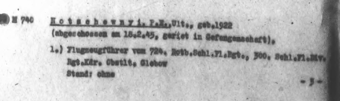 Опубликовано: 12 января 44 минуты назад, катуар сказал: У немцев: Ночевный П.Е. мл. л-т 1922 г.р. сбит 18.2.1945 (?), захвачен в плен (?). пилот 724 шап из 300 шад. У нас мл. л-т Ночевный Петр Ефимович 1922 г.р. нбз 18.2.1945. Косвенное свидетельство, что остался жив -Приказ об исключении из списков отменен в 1956 г. 1 Упомянуть пользователя Поделиться сообщением Ссылка на сообщение Поделиться на других сайтах