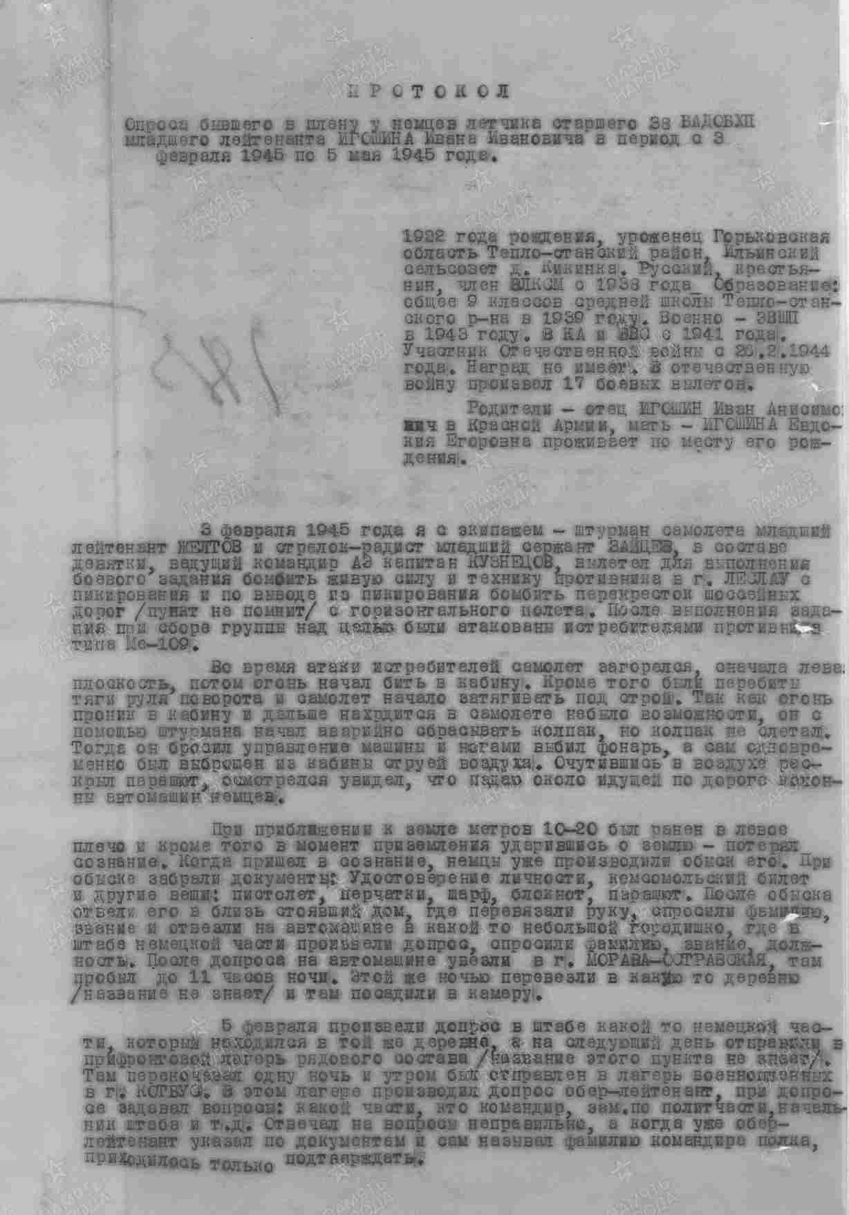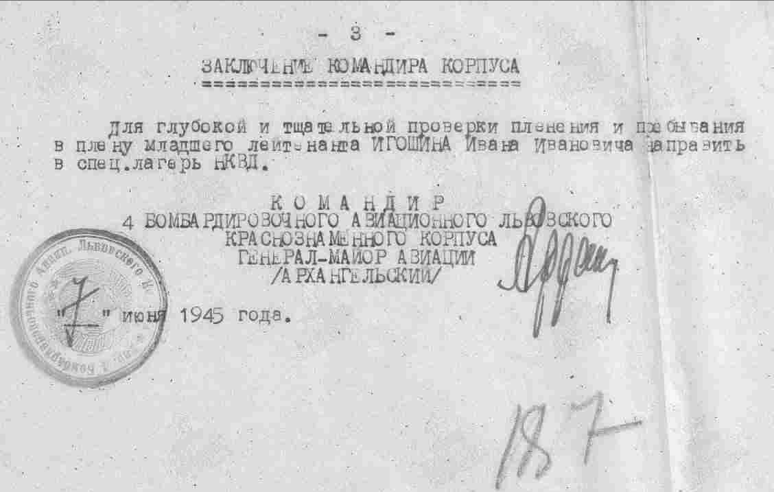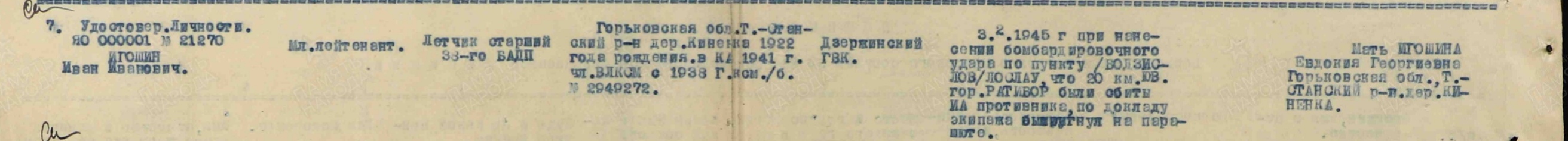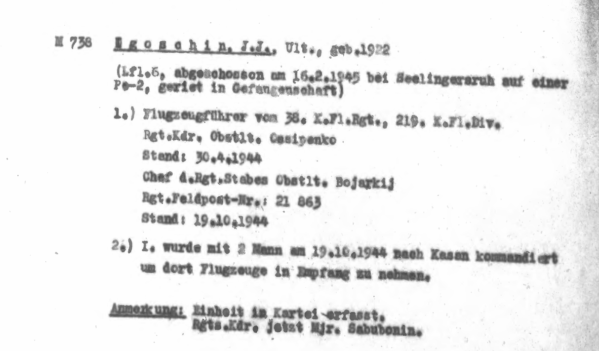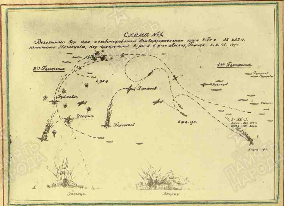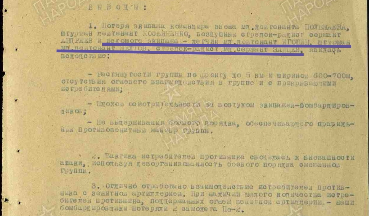 Опубликовано: 14 января Игошин И. И. установлен абсолютно точно. Это лётчик 1 АЭ 38 бап 219 бад 4 бак, сбит 03.02.45 при бомбардировке н. п. Лослау (у границы Польши и Германии): В жбд 219 бад приведена схема боя, в котором был сбит Игошин, и дан анализ причин 2-х наших потерь Пе-2 в результате этого боя: А дата 16.02.45 попала в нем. док-т как день сбития при очередной пересылке Игошина из одного лагеря в/пленных в другой (в лагере в/пленных в г. Бухау /Германия/ указали дату допроса как дату сбития). Это становится ясно, прочитав внимательно объяснительную записку, данную Игошиным после возвращения из плена, а также документы его опроса в дивизии: Мл. лейтенант Игошин И. И. успешно прошёл тщательную гос. проверку и продолжил службу, которую завершил 04.04.49 лейтенантом. В 85 г награжден юбилейным орденом ОВ 2 ст. 5 Упомянуть пользователя Поделиться сообщением Ссылка на сообщение Поделиться на других сайтах