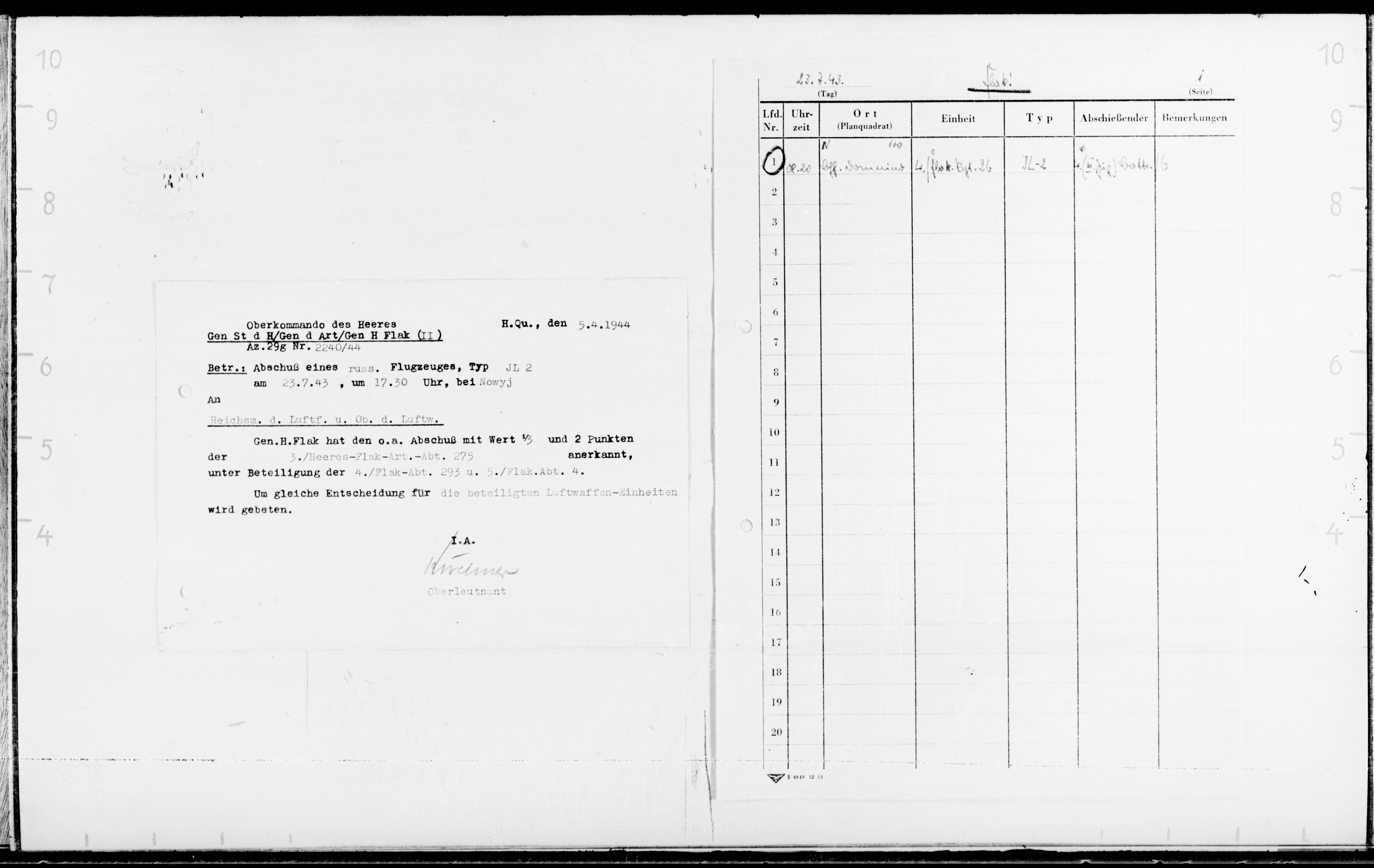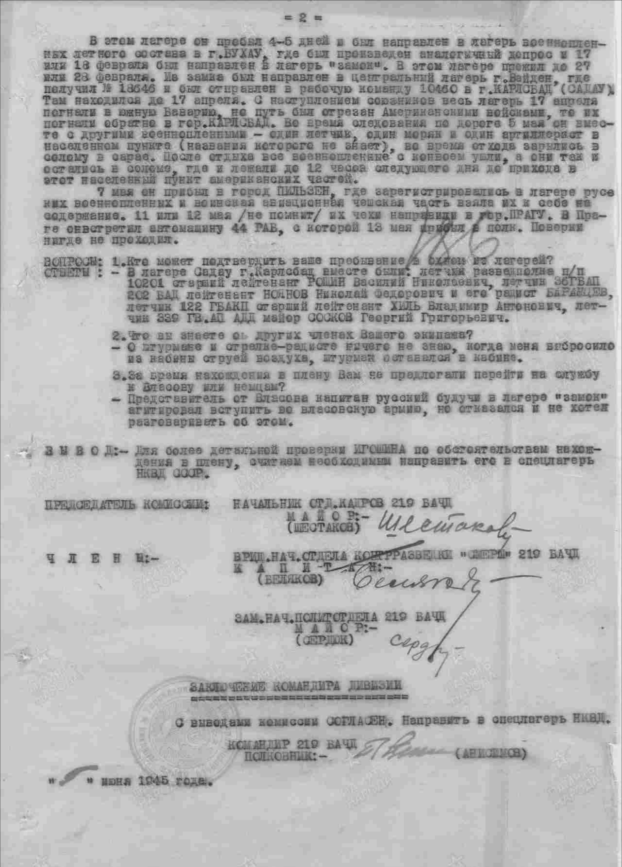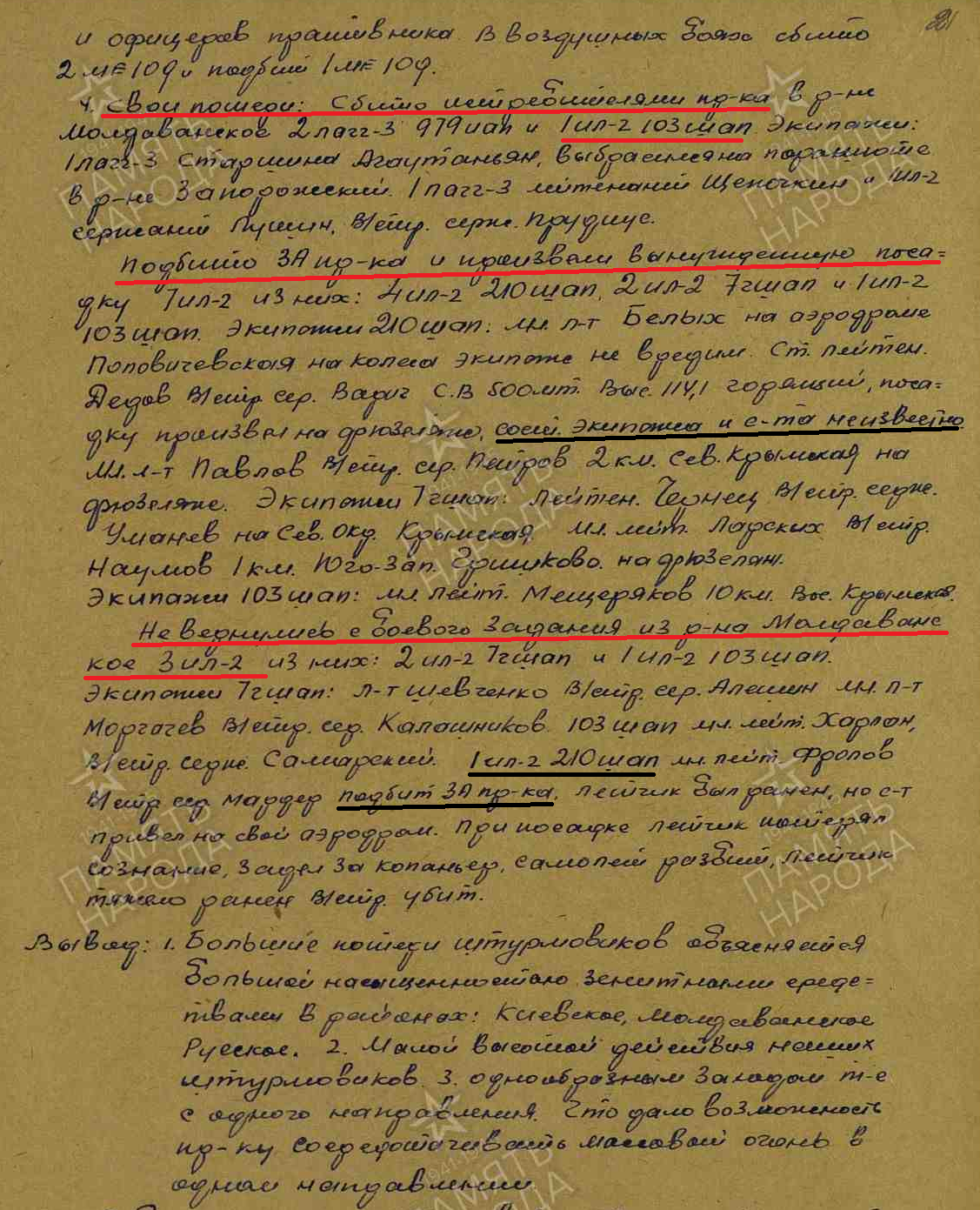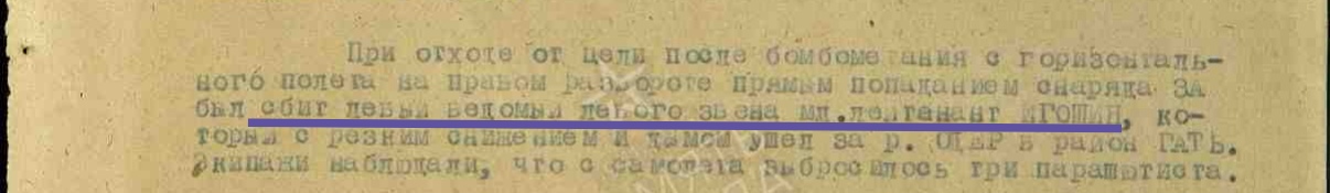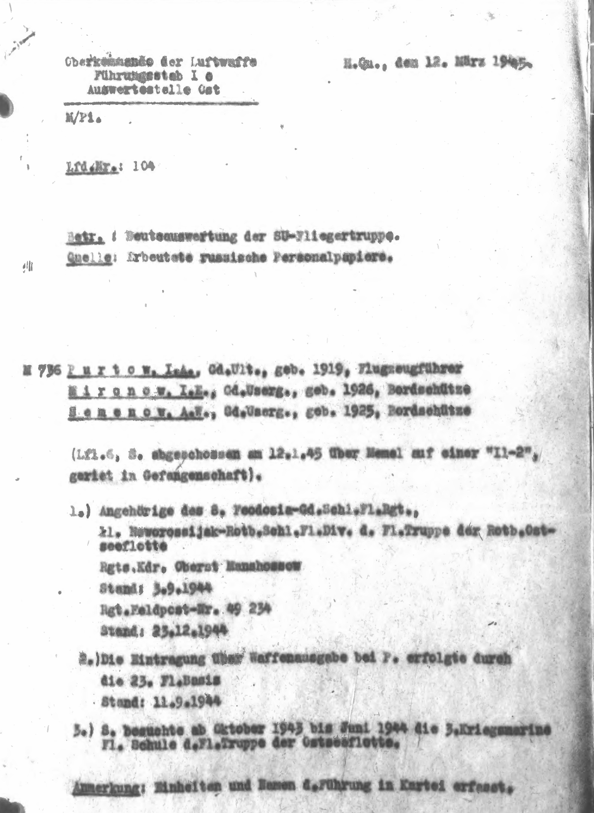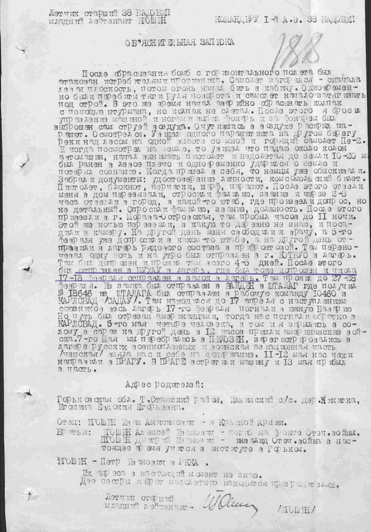 Опубликовано: 14 января Игошин И. И. установлен абсолютно точно. Это лётчик 1 АЭ 38 бап 219 бад 4 бак, сбит 03.02.45 при бомбардировке н. п. Лослау (у границы Польши и Германии): В жбд 219 бад приведена схема боя, в котором был сбит Игошин, и дан анализ причин 2-х наших потерь Пе-2 в результате этого боя: А дата 16.02.45 попала в нем. док-т как день сбития при очередной пересылке Игошина из одного лагеря в/пленных в другой (в лагере в/пленных в г. Бухау /Германия/ указали дату допроса как дату сбития). Это становится ясно, прочитав внимательно объяснительную записку, данную Игошиным после возвращения из плена, а также документы его опроса в дивизии: Мл. лейтенант Игошин И. И. успешно прошёл тщательную гос. проверку и продолжил службу, которую завершил 04.04.49 лейтенантом. В 85 г награжден юбилейным орденом ОВ 2 ст. 5 Упомянуть пользователя Поделиться сообщением Ссылка на сообщение Поделиться на других сайтах