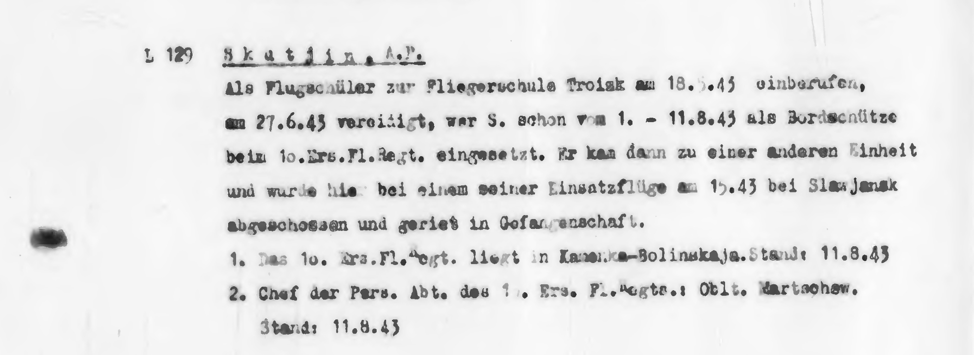 Опубликовано: 17 января В 11.01.2026 в 15:27, skylark сказал: В этом плохо различимом документе вроде бы упоминается мл. л-т Батраков сбитый 15(?).8.43 у Славянска. У нас, как вариант, среди нескольких потерь 672 шап 306 шад 16 августа 1943 года есть экипаж в составе: лётчик мл. лейтенант Батраков Василий Васильевич (уроженец с. Покровка Джети-Огузского р-на Иссык-Кульской обл. Киргизской ССР) и воздушный стрелок рядовой Скутин Александр Поликарпович (1925 г.р., уроженец д. Хайдук Сарафановского с/с Егоршинского р-на Свердловской обл.). Экипаж не вернулся из боевого вылета на штурмовку аэродрома Краматорская Донецкой обл. (Славянск в 14 км севернее). 3 часа назад, катуар сказал: Этот документ, в котором упоминается красноармеец/рядовой Скутин Александр Поликарпович, косвенно подтверждает ранее высказанный вариант о сбитом 16.08.43 г. у Славянска экипаже Батраков-Скутин. 2 Упомянуть пользователя Поделиться сообщением Ссылка на сообщение Поделиться на других сайтах