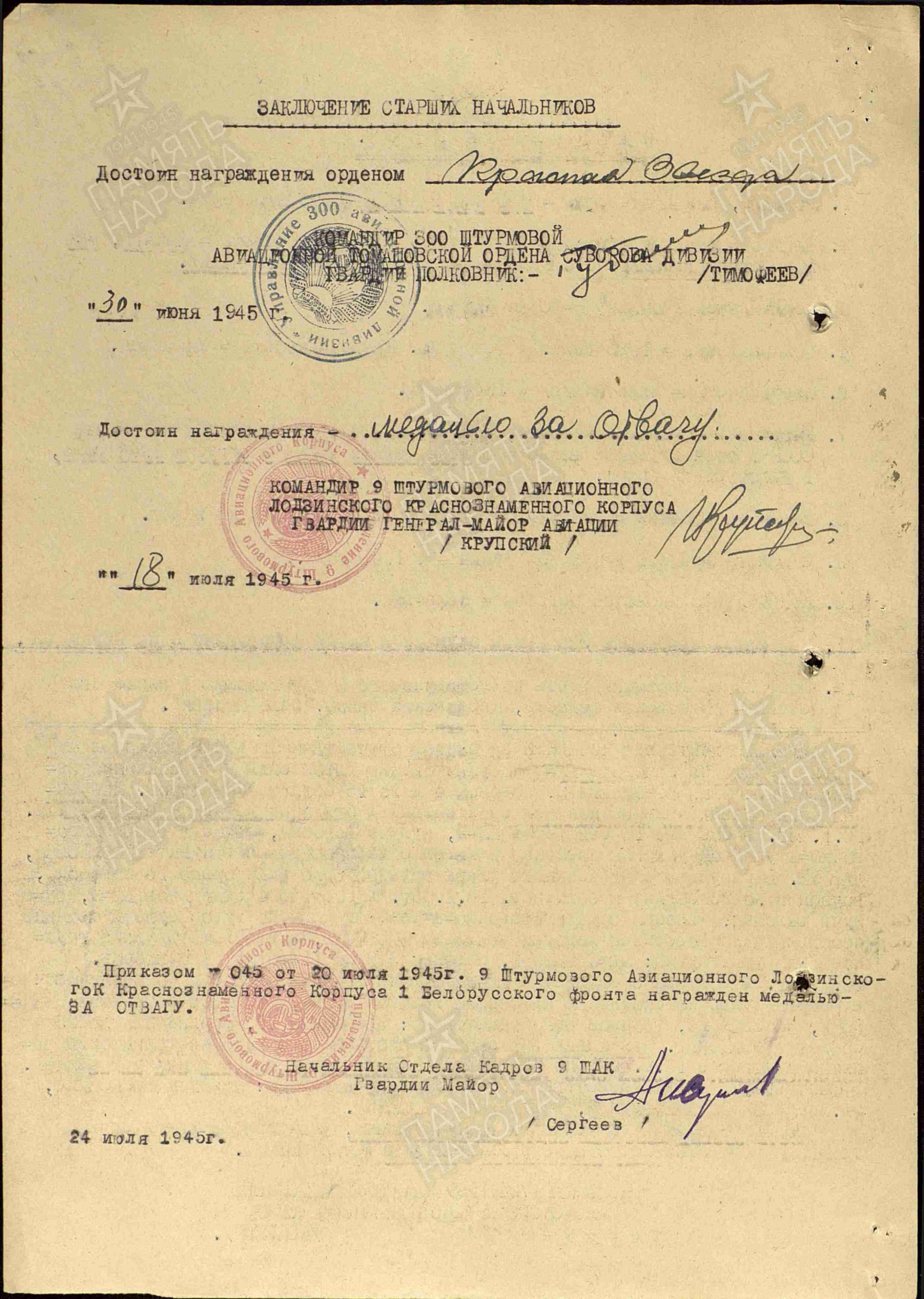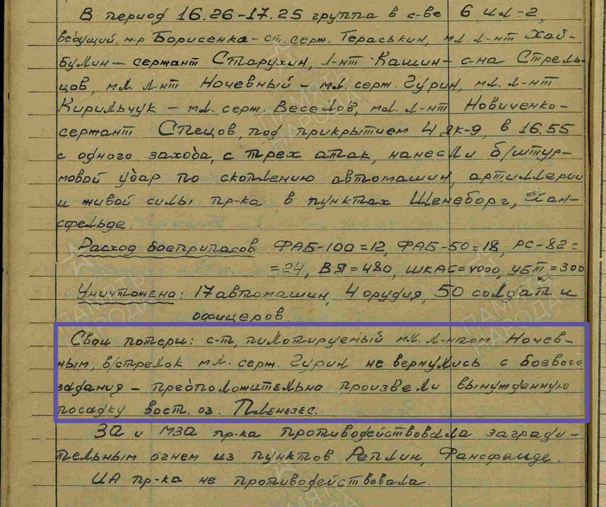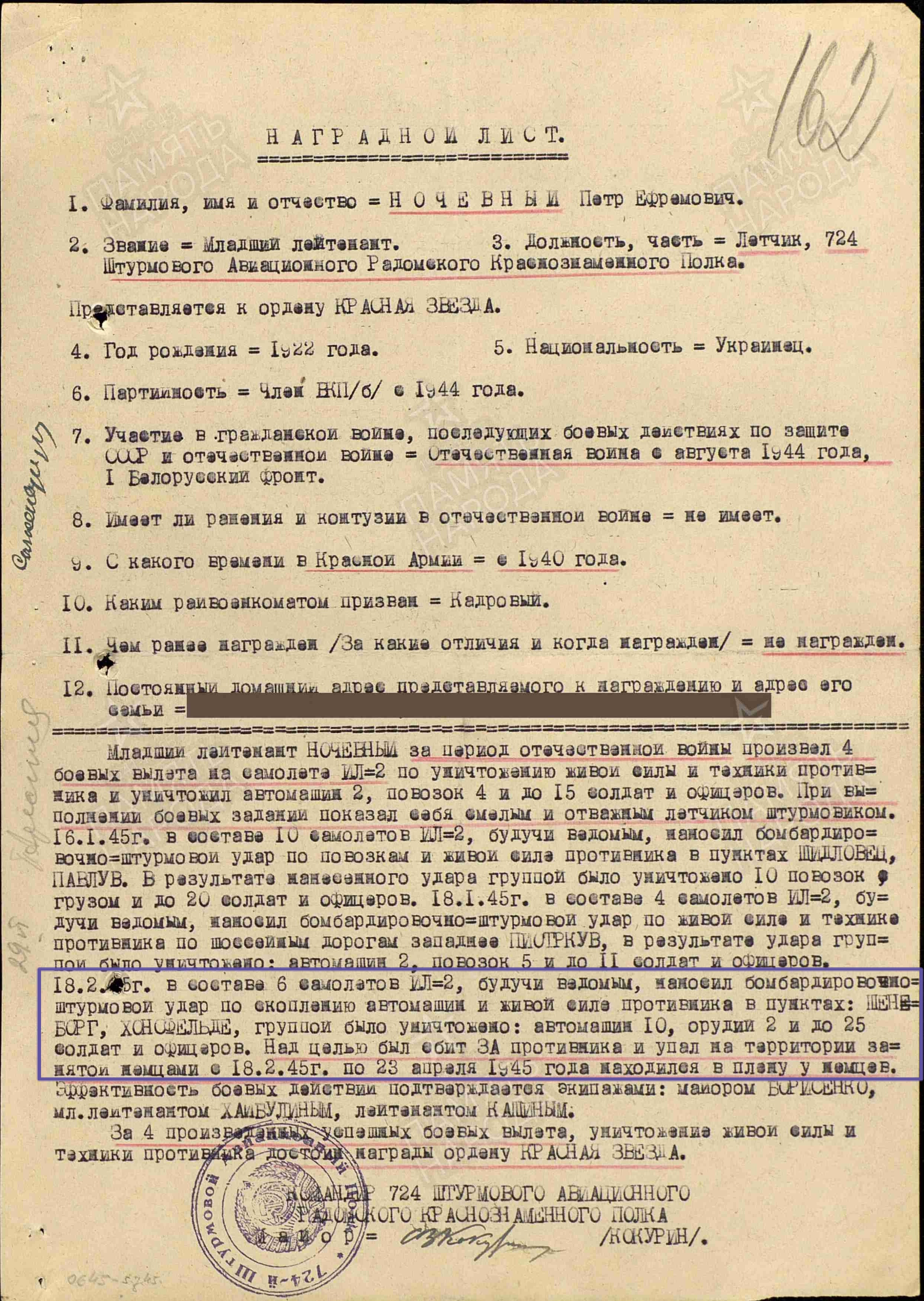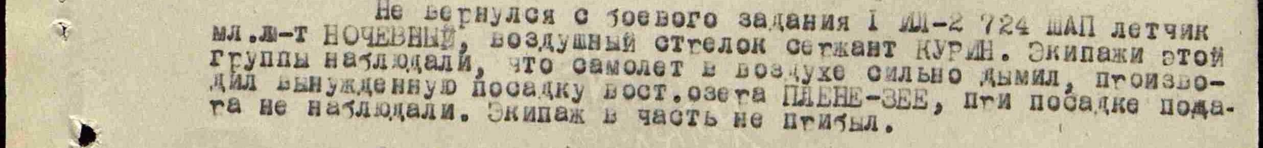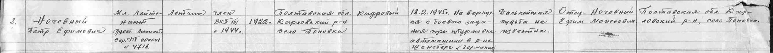Опубликовано: 12 января Дополнение по Ночевному Петру Ефимовичу (Ефремовичу — в нагр. док-тах). Дата рождения 18.02.1922 г. В 1944 г по окончании Борисоглебской ВАШП им. В. П. Чкалова направлен на службу в 724 шап 300 шад 9 шак. 18.02.45 (в день свого рождения) в интервале 16.26 — 17.25 в составе группы 6 Ил-2 выполнял боевое задание по штурмовке скопления техники противника в р-не Шенсберг (Германия). При возвращении с задания его с-т был подбит над целью и упал на территории, занятой немцами. С 18.02.45 по 23.04.45 находился в плену. Вернулся. 20.07.45 командованием 9 шак награжден медалью "За отвагу" (командованием полка и дивизии был представлен к ордену Красной Звезды). Кроме того, награждён ещё 3-мя медалями: "За победу над Германией", "За взятие Берлина", "За освобождение Варшавы". Завершил службу 27.12.48 в звании лейтенанта. Из жбд 724 шап 300 шад за 18.02.45: P. S. Судьбу его в/стрелка выяснить не получилось, видимо, неточно указана фамилия: Гурин, Курин...? 3 Упомянуть пользователя Поделиться сообщением Ссылка на сообщение Поделиться на других сайтах