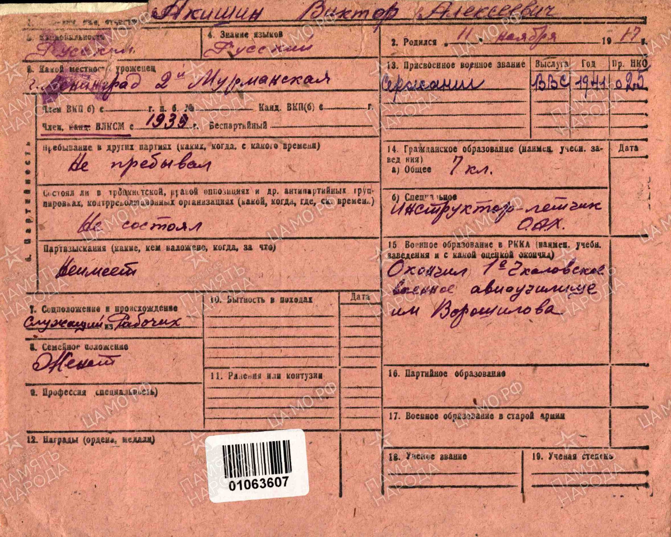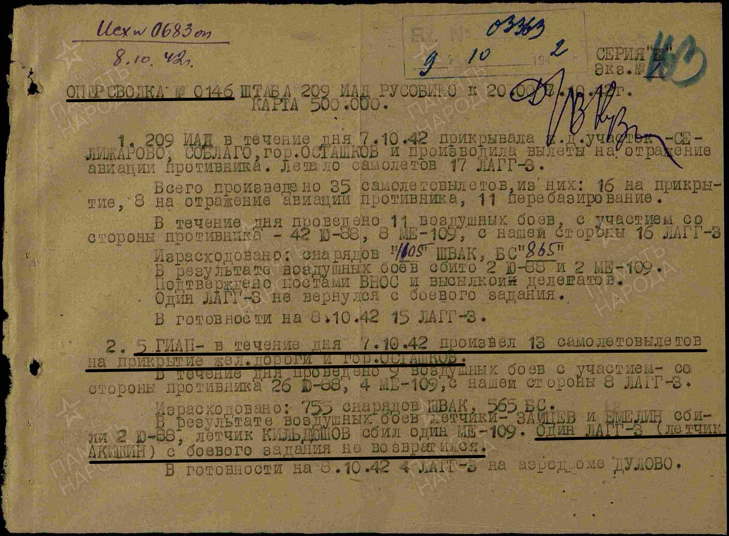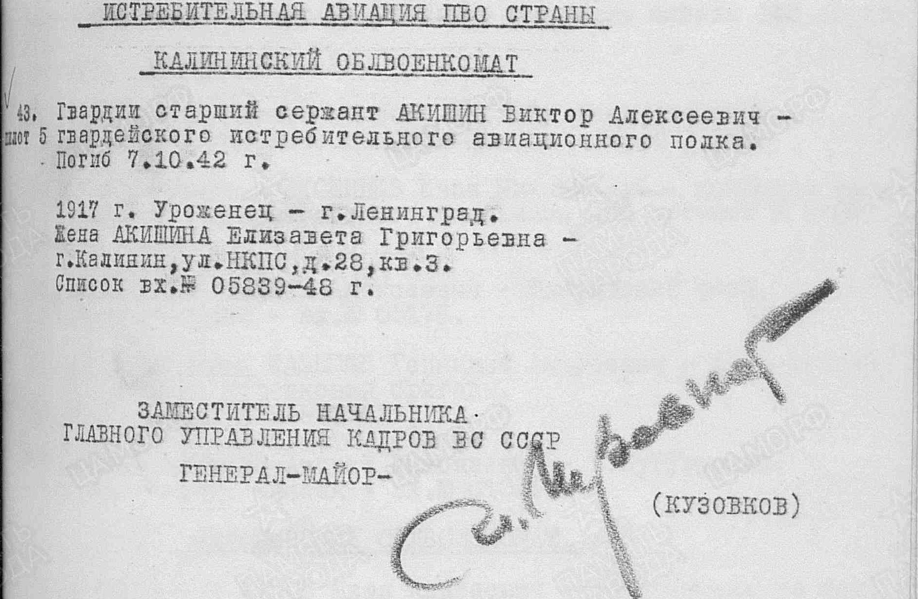 Опубликовано: 14 марта Дополню. Лётчик Акишин упомянут в 2-х оперсводках 209 иад: в первой (от 07.10.42) сообщается, что не вернулся с б/з; во второй (от 09.10.42) уточняется, что Акишин погиб - сбит в воздушном бою в р-не д. Раменье, выполняя задание по прикрытию г. Осташков; его самолёт разбит. Таким образом, судьба Акишина стала известна ч/з сутки после гибели. Имеется УПК гвардии старшего сержанта Акишина Виктора Алексеевича (11.11.1917 - 07.10.1942). Он уроженец г. Ленинграда (до 26.01.1924 г называвшегося Петроградом) - ровесник Октябрьской революции. К сожалению, в УПК много пробелов, она неподробная... После школы Акишин - лётчик-инструктор ОСОАВИАХИМА. В октябре 38 Алма-Атинским РВК Казахской ССР призван в ряды РККА; 23 февраля 39 принял военную присягу; стал курсантом 1-го Чкаловского ВАУ лётчиков им. К. Е. Ворошилова (ныне г. Оренбург). 31.01.41 ему присвоено военное звание сержанта и по завершении обучения направлен в Краснодарскую ВАШ лётчиком-инструктором. С началом ВОВ - лётчик 5 гиап 209 иад - в действующей армии. 07.10.42 - погиб при выполнении б/з. Был женат. Жена Акишина Елизавета Григорьевна. В док-тах осени 42 г указан адрес её проживания г. Пугачёв - это Саратовская обл.. В более поздних документах (лето и осень 48 г) указано, что она проживает в г. Калинин Калининской обл., и отмечено, что сам Акишин призван в РККА Центральным РВК г. Калинин. Возможно, стоит попытаться поискать его родных и по этому адресу - в г. Калинин (Тверь). (док-т от 30.11.48) 5 Упомянуть пользователя Поделиться сообщением Ссылка на сообщение Поделиться на других сайтах