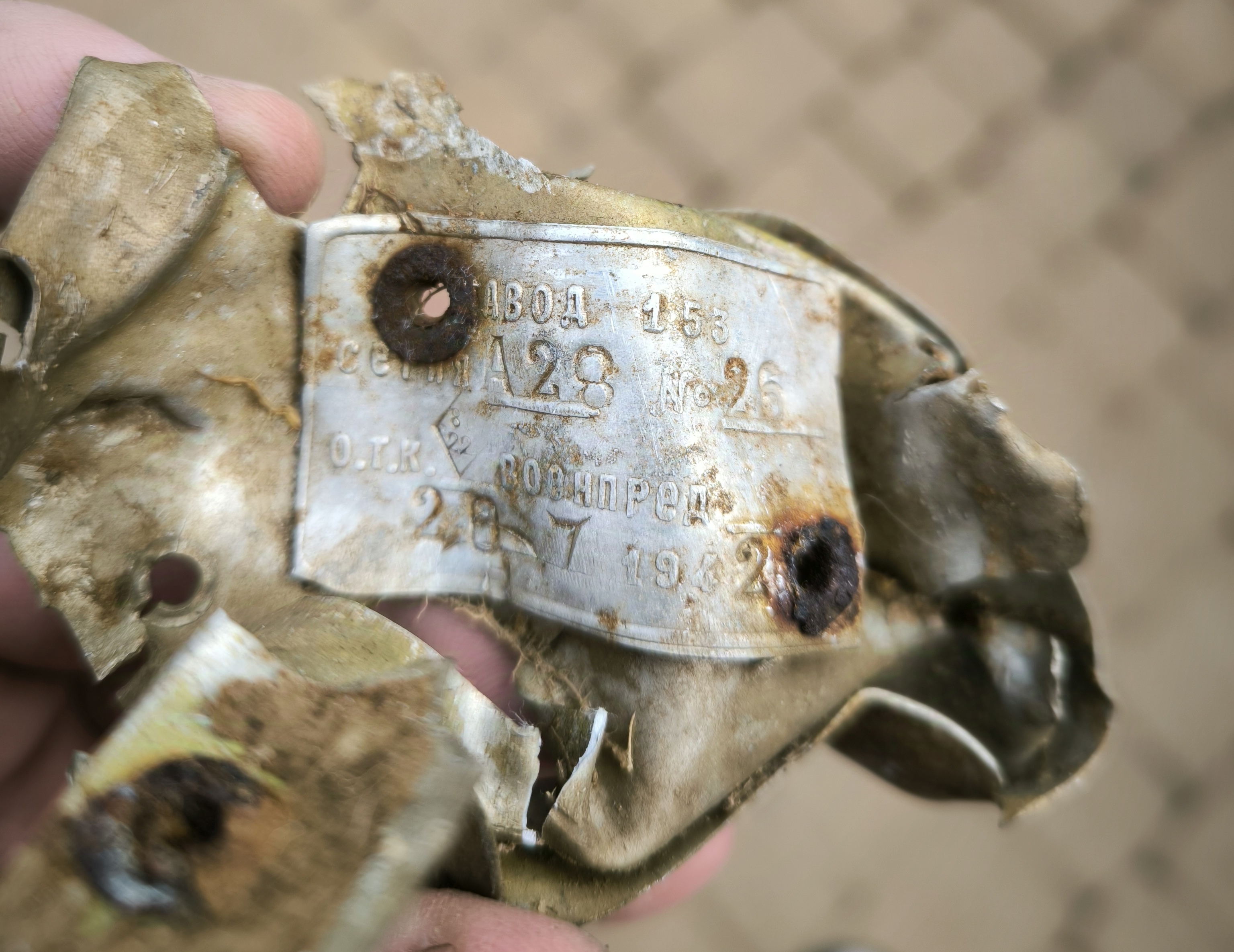 На МП этого самолета найдены два аналогичных  шильдика  Завод 153 СЕРИЯ А 28  №26  ОТК. 8/22 ВОЕНПРЕД  дата 28.07.1942  и второй ЗАВОД 15( на изломе, цифры 3 нет) СЕРИЯ А (Л) 27, ОТК 8/4, ВОЕНПРЕД  даты  не видно 19( окончание отломано).Шильда очень убитая.  В обсуждениях на форуме говорят, что это "технология" и что крепились эти шильды на каких то агрегатах (деталях), но так нигде и не прочел, на каких же агрегатах(деталях) они крепились. Какие есть предположения. Или может кто знает.  Видно, что Первая шильда крепилась на каком то фрагменте, то ли корпуса, то ли обшивки.