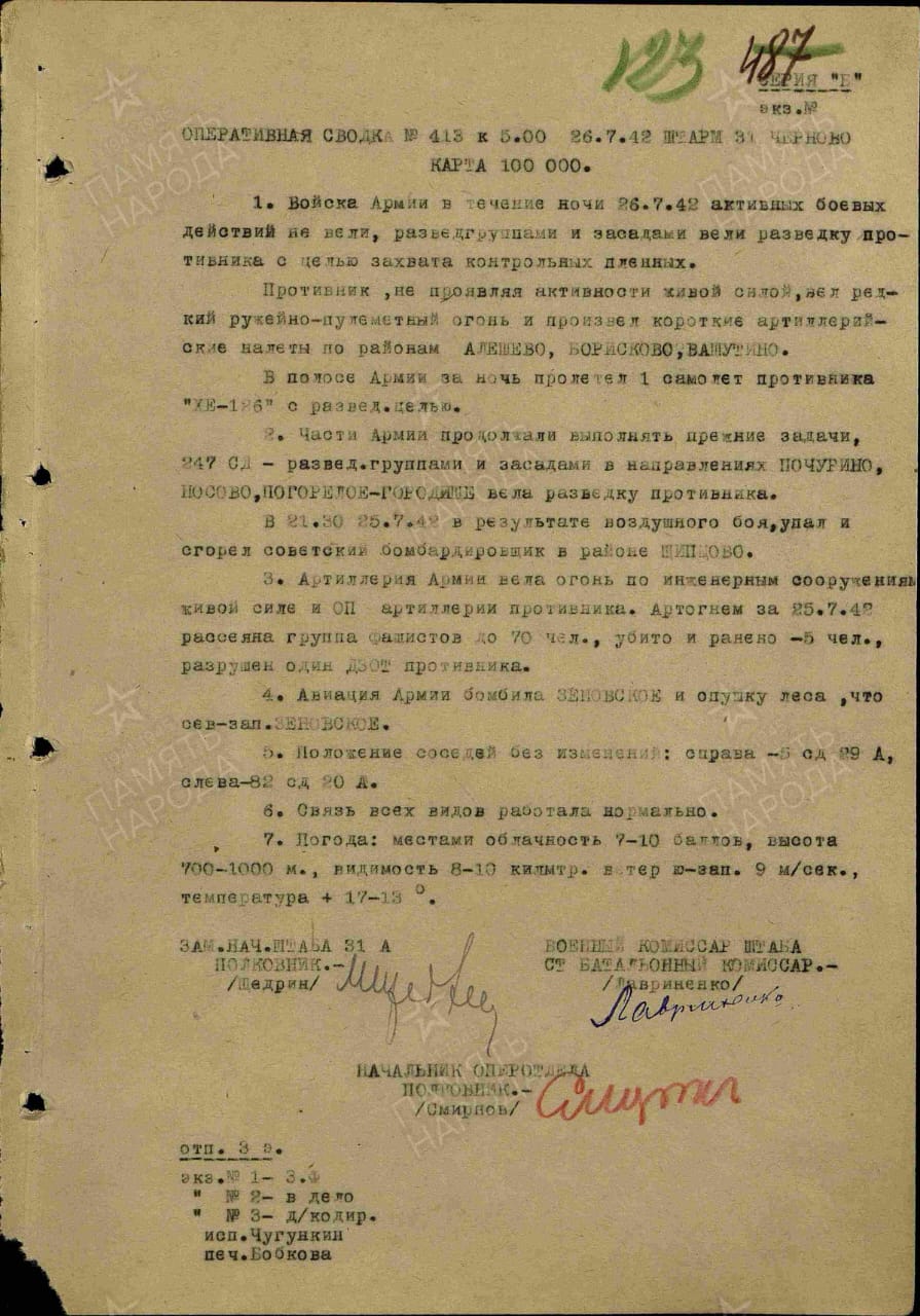 Опубликовано: 14 августа, 2025 9 часов назад, Взвод сказал: Архивным документом по номеру самолёта Пе-2 и его моторам 793 бапа экипажа Ивкин-Дегтярнв-Калугин, погибших 25 июля 1942 года не обладаем. Если кто покажет выжимку будем благодарны! Проанализировав потери Пе-2 с учётом дат имеющихся АФС, номера завода 22 и самого МП на местности других альтернатив не видим! 793 бап .8/80 115-797 115-781 25.07.1942 Ивкин с-т 8/80. иа 25.07.1942 Ивкин р-н Ржев-Сычевка упал терр пр-ка раз. Помельница Есть еще потеря за этот день - Чугаев, но у него моторы номера 21-ххх и р-н Ржев-Сычевка упал на нашей терр Коледино 27 км Ржев 1 Упомянуть пользователя Поделиться сообщением Ссылка на сообщение Поделиться на других сайтах