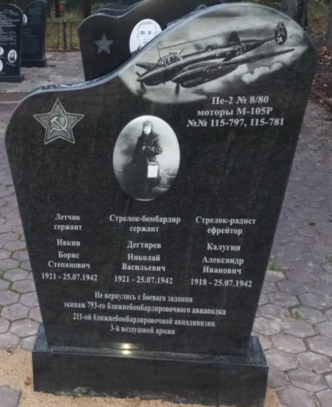 Опубликовано: 30 мая, 2025 В 12.05.2025 в 20:17, Взвод сказал: Наша небольшая команда дополняет друг друга: после нашего непродолжительного выхода на данное МП, тем, кто был дома на АфС удалось понять, что МП образовалось в период с 7 мая по 21 сентября 1942 г. Далее удалось найти сводку наземных частей по той местности, где найдено МП, где за 25 июля 1942 года упоминается о падении бомбардировщика, который сгорел с экипажем и упал около д. Щипцово (это и есть Шевцово на современных картах). За 25 июля у нас только один экипаж "привязывается" к данному месту, который погиб в полном составе, но, почему-то увековечен в Смоленской области ... Конечно, нужно зачищать МП, но может у кого-то есть сведения по Пешкам, нбз 25.07.1942 г.?! Привет всем. Думаем вот этот экипаж?! Пока версия... Но "по оперативным данным" номера моторов пешки данного экипажа начинались на 115... и дата потери 25 июля совпадает с данными 251 сд: 25.07.42 г. при выполнении боевого задания по бомбардировке ж.д. участка Ржев - Сычевка зенитной артиллерией сбит самолет Пе-2. Самолет упал на территории противника. Погиб экипаж: летчик сержант Б.С.Ивкин, стрелок-бомбардир сержант Н.В.Дегтярев, стрелок-радист А.И.Калугин. Похоронены в д. Клепики. Перезахоронены в братской могиле No. 2 на восточной окраине г. Гагарин Смоленской области. 1 Упомянуть пользователя Поделиться сообщением Ссылка на сообщение Поделиться на других сайтах