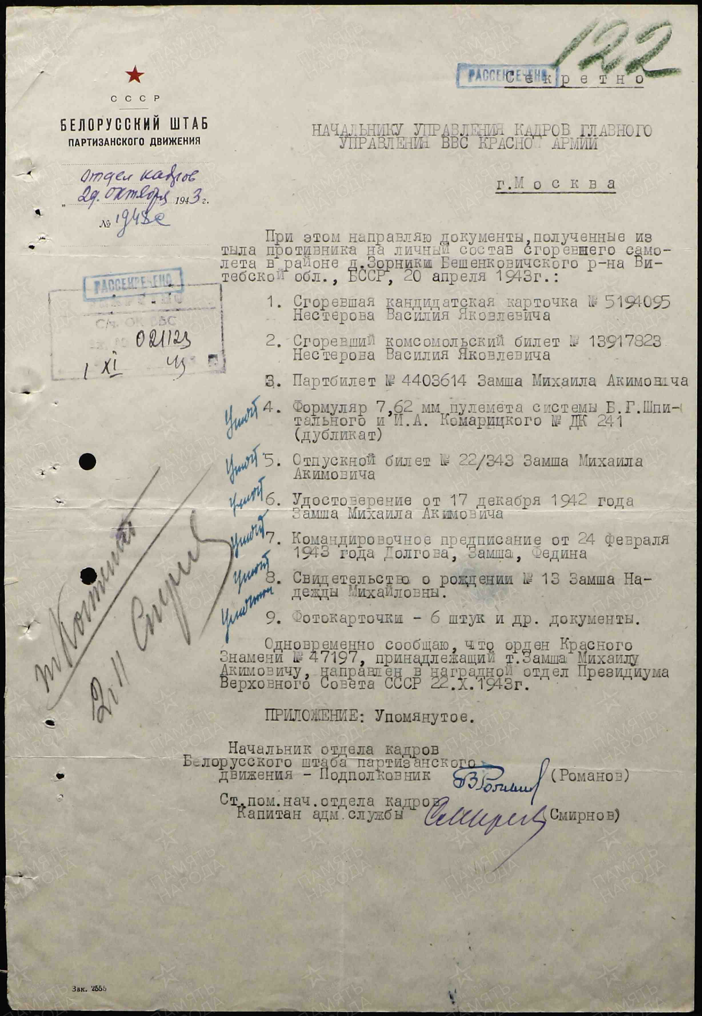 Белорусский штаб партизанского движения сообщает - https://obd-memorial.ru/html/info.htm?id=1168571702 - , что в районе д. Зорники Бешенковичского р-на Витебской обл. сгорел самолет, летчики погибли, высылаются найденные документы двух человек и орден БКЗ