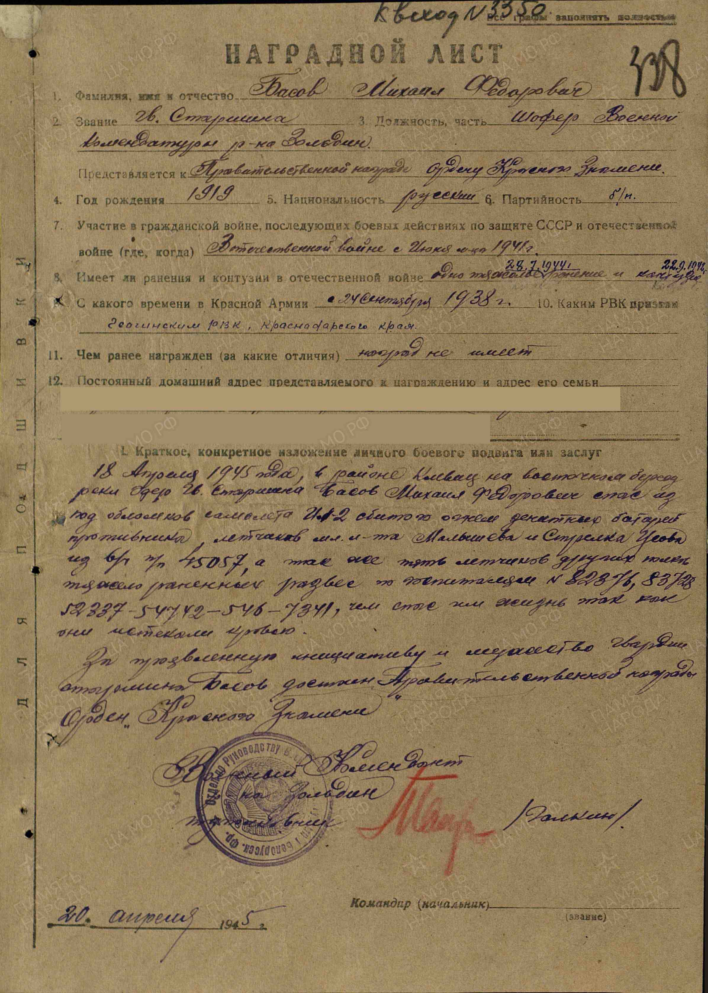 За проявленную инициативу и мужество, гвардии старшина Басов достоин Правительственной награды Орден «Красного Знамени»