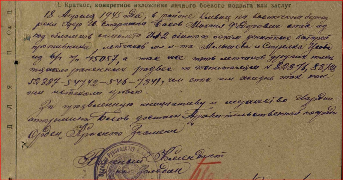 18 апреля 1945 года, в районе Клевиц (Chlewice) на восточном берегу реки Одер, гв. старшина Басов Михаил Федорович, спас из под обломков самолета Ил-2, сбитого огнем зенитных батарей противника, летчика мл. лейтенанта Малышева и стрелка Усова из в/ч п/п 45057, а также пять летчиков других полков, тяжело раненых развез по госпиталям №82376, 823728, 52337- 54742- 546- 7341, чем спас им жизнь, так как они истекали кровью.